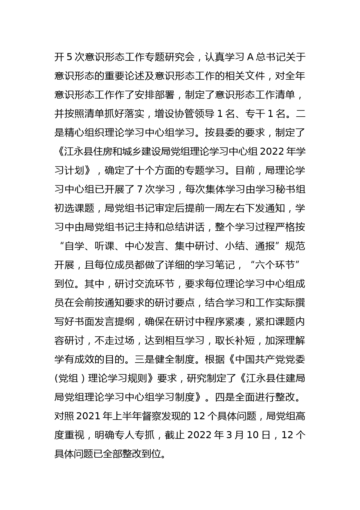 中共江永縣住房和城鄉(xiāng)建設(shè)局黨組關(guān)于巡察整改進(jìn)展情況的通報(bào)中共江永縣住房和城鄉(xiāng)建設(shè)局黨組關(guān)于巡察整改進(jìn)展情況的通報(bào)根據(jù)縣委統(tǒng)一部署,2021年9月22日至11月30日,縣委第一巡察組對(duì)縣住建局黨組進(jìn)行了常規(guī)巡察。2022年1月25日,縣委巡察組向縣住建局黨組反饋了巡察意見。按照黨務(wù)公開原則和巡察工作有關(guān)要求,現(xiàn)將巡察整改進(jìn)展情況予以公布??h委巡察反饋我局3個(gè)方面12個(gè)問題,目前11個(gè)問題已整改完成,1個(gè)問題整改基本完成,召開專題研究會(huì)議3次,督察督辦6個(gè),開展專項(xiàng)整治2項(xiàng),建章立制5項(xiàng)。一、工作履職不到位,貫徹落實(shí)上級(jí)決策部署不深入1.意識(shí)形態(tài)工作責(zé)任落實(shí)...