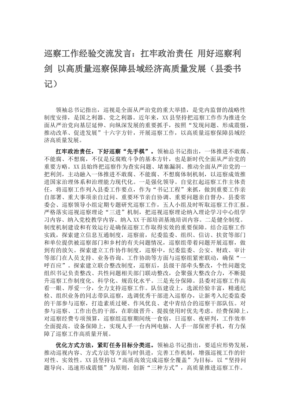 巡察工作經(jīng)驗交流發(fā)言:扛牢政治責任用好巡察利劍以高質(zhì)量巡察保障縣域經(jīng)濟高質(zhì)量發(fā)展(縣委書記)領袖總書記指出,巡視是全面從嚴治黨的重大舉措,是黨內(nèi)監(jiān)督的戰(zhàn)略性制度安排,是國之利器、黨之利器。近年來,XX縣堅持把巡察工作作為推進全面從嚴治黨向基層延伸、向縱深發(fā)展的重要抓手,按照“發(fā)現(xiàn)問題、形成震懾,推動改革、促進發(fā)展”十六字方針,開展巡察工作,以高質(zhì)量巡察保障縣域經(jīng)濟高質(zhì)量發(fā)展??咐握呜熑?,下好巡察“先手棋”。領袖總書記指出,一體推進不敢腐、不能腐、不想腐,不僅是反腐敗斗爭的基本方針,也是新時代全面從嚴治黨的重要方略。XX縣始終把...