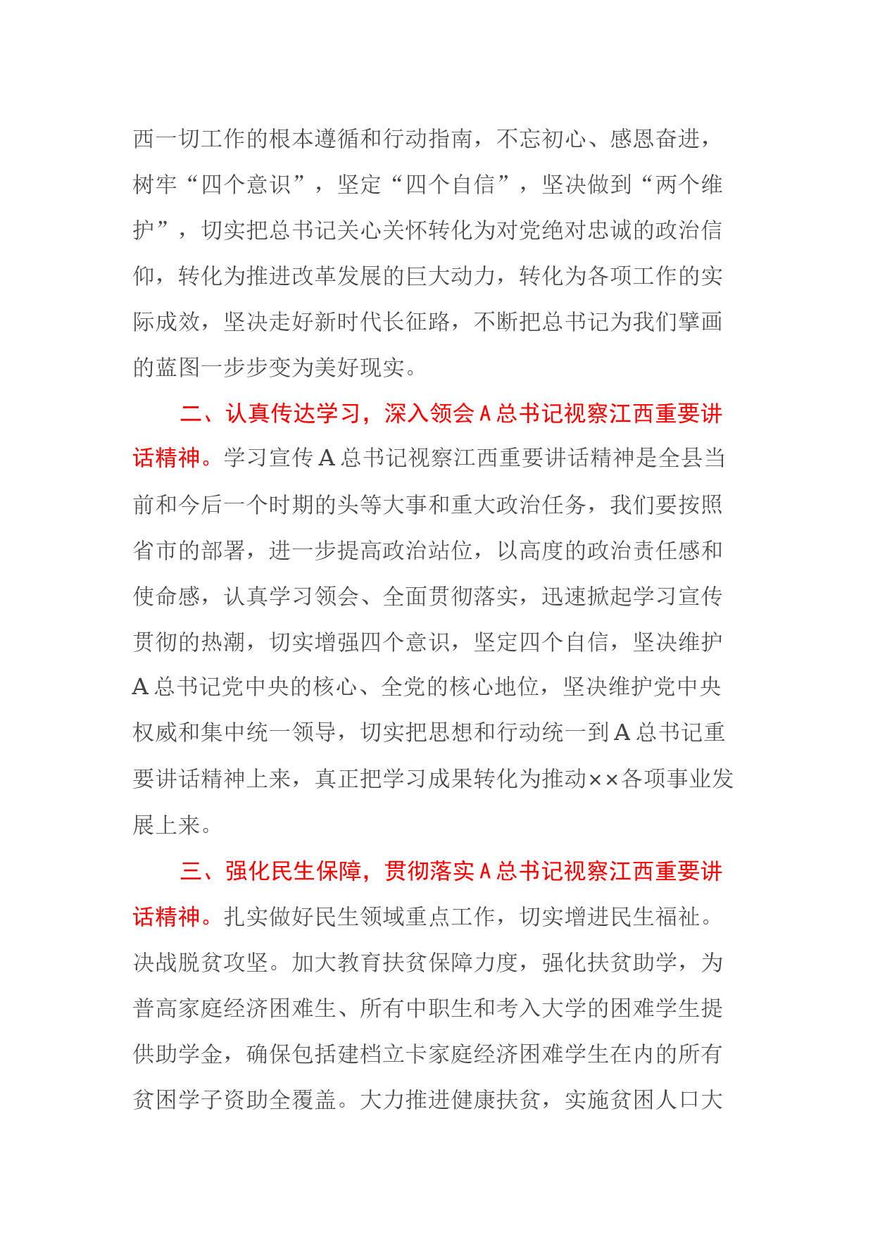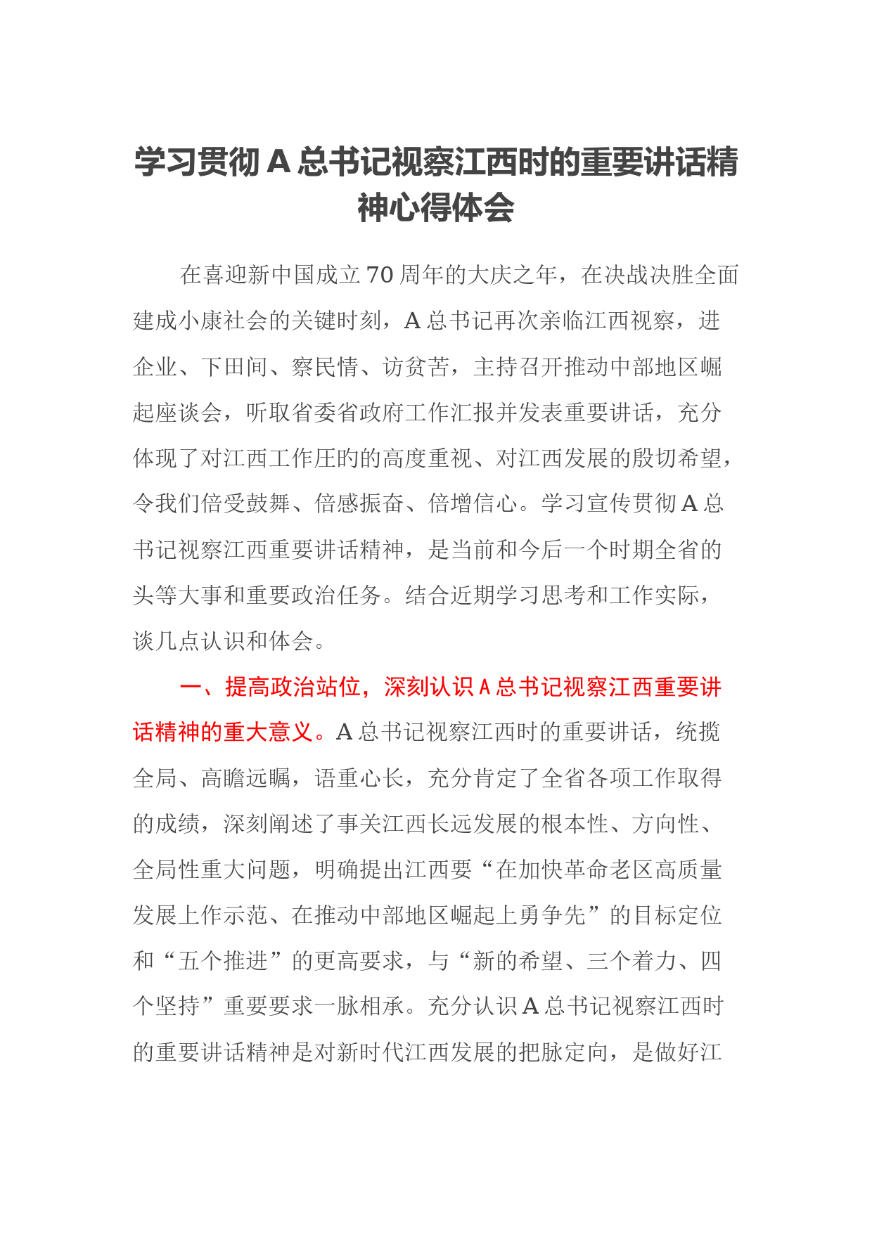 學(xué)習(xí)貫徹A總書記視察江西時的重要講話精神心得體會在喜迎新中國成立70周年的大慶之年,在決戰(zhàn)決勝全面建成小康社會的關(guān)鍵時刻,A總書記再次親臨江西視察,進(jìn)企業(yè)、下田間、察民情、訪貧苦,主持召開推動中部地區(qū)崛起座談會,聽取省委省政府工作匯報并發(fā)表重要講話,充分體現(xiàn)了對江西工作圧旳的高度重視、對江西發(fā)展的殷切希望,令我們倍受鼓舞、倍感振奮、倍增信心。學(xué)習(xí)宣傳貫徹A總書記視察江西重要講話精神,是當(dāng)前和今后一個時期全省的頭等大事和重要政治任務(wù)。結(jié)合近期學(xué)習(xí)思考和工作實際,談幾點認(rèn)識和體會。一、提高政治站位,深刻認(rèn)識A總書記視察江西重要講話精神...