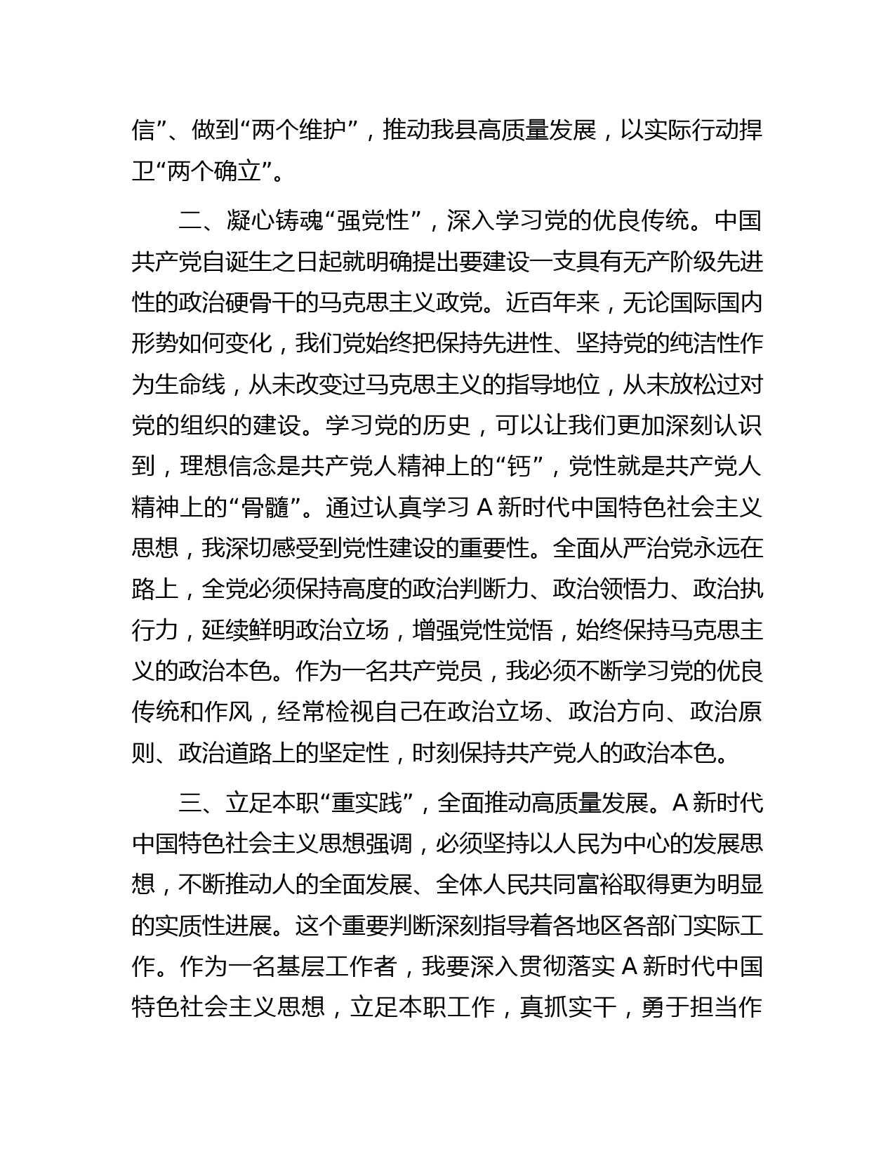 縣長在縣委主題教育第二次交流研討會上的發(fā)言材料在這次主題教育學(xué)習(xí)中,我深切感受到A新時代中國特色社會主義思想不僅包括了治國理政的重大理論和策略,還貫穿了中國共產(chǎn)黨人的政治品格、價值追求、精神境界和作風(fēng)要求,包含著深厚的真理力量、實踐力量和人格力量,增強(qiáng)了我對黨的創(chuàng)新理論在政治認(rèn)同、思想認(rèn)同、理論認(rèn)同和情感認(rèn)同方面的認(rèn)識。我堅持讀原著、學(xué)原文、悟原理,進(jìn)一步加深了對“學(xué)思想、強(qiáng)黨性、重實踐、建新功”總要求的理解,受到很大感染和啟發(fā)。一、深學(xué)細(xì)悟“學(xué)思想”,堅決捍衛(wèi)“兩個確立”。A新時代中國特色社會主義思想是馬克思主義中國化的最新...