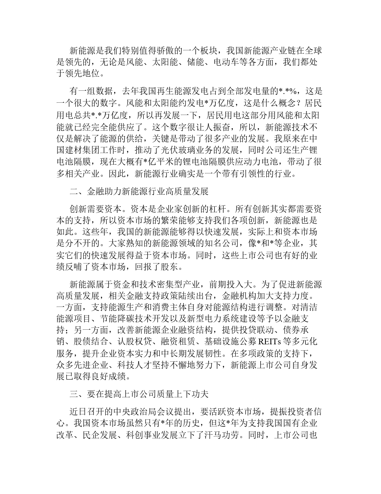 會長在證券新能源論壇上的主題演講稿尊敬的董事長,各位領(lǐng)導(dǎo)、各位嘉賓:大家好!非常高興參加本次論壇。這次會議選在很有意義,因為是資本市場最活躍的地區(qū)之一,也是上市公司聚集比較多的地區(qū)。目前,省A股上市公司有家,總市值.萬億元,市有A股上市公司家,加上境外上市公司有多家,A股總市值為.萬億元。同時,又是全國新能源業(yè)務(wù)占比最大的省份。今天現(xiàn)場來了不少在新能源方面做得比較優(yōu)秀的企業(yè),像等等,這些都是新能源上市公司的佼佼者。在這里,我想和大家一起交流關(guān)于資本市場和新能源之間的關(guān)系。一、我國新能源建設(shè)正處在蓬勃發(fā)展期現(xiàn)在大家對經(jīng)濟的看法最重...