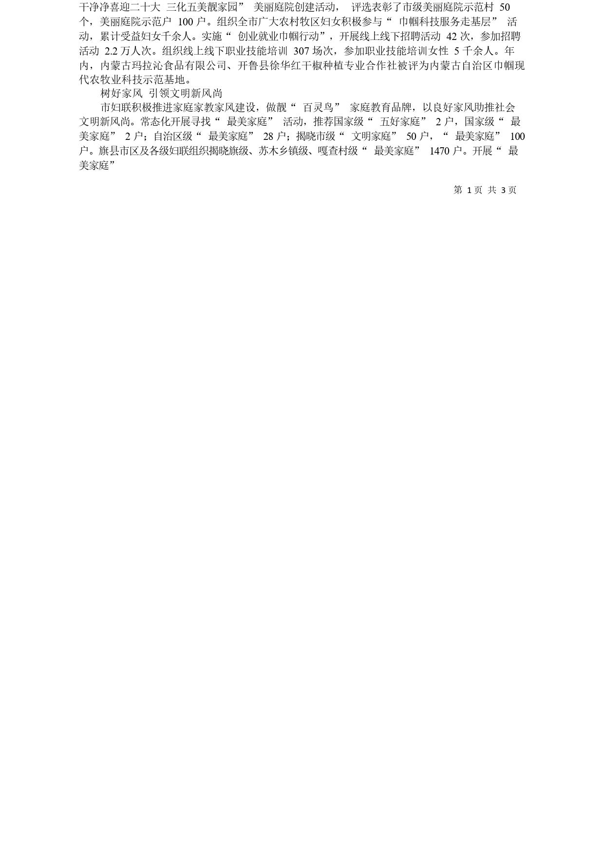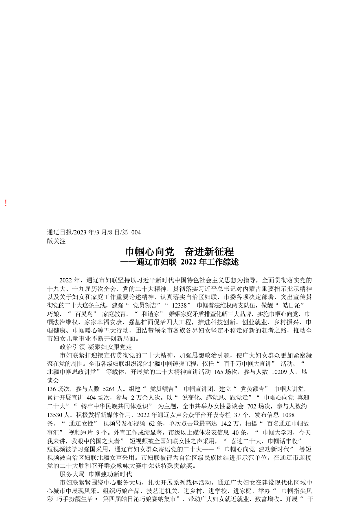 !通遼日?qǐng)?bào)/2023年/3月/8日/第004版關(guān)注巾幗心向黨奮進(jìn)新征程——通遼市婦聯(lián)2022年工作綜述2022年,通遼市婦聯(lián)堅(jiān)持以習(xí)近平新時(shí)代中國(guó)特色社會(huì)主義思想為指導(dǎo),全面貫徹落實(shí)黨的十九大、十九屆歷次全會(huì)、黨的二十大精神,貫徹落實(shí)習(xí)近平總書記對(duì)內(nèi)蒙古重要指示批示精神以及關(guān)于婦女和家庭工作重要論述精神,認(rèn)真落實(shí)自治區(qū)婦聯(lián)、市委各項(xiàng)決定部署,突出宣傳貫徹黨的二十大這條主線,建強(qiáng)“黨員額吉”“12338”巾幗普法維權(quán)兩支隊(duì)伍,做靚“皓日沁”巧娘、“百靈鳥”家庭教育、“和諧家”婚姻家庭矛盾排查化解三大品牌,實(shí)施巾幗心向黨、巾幗法治維權(quán)、家家幸福安康、強(qiáng)基...