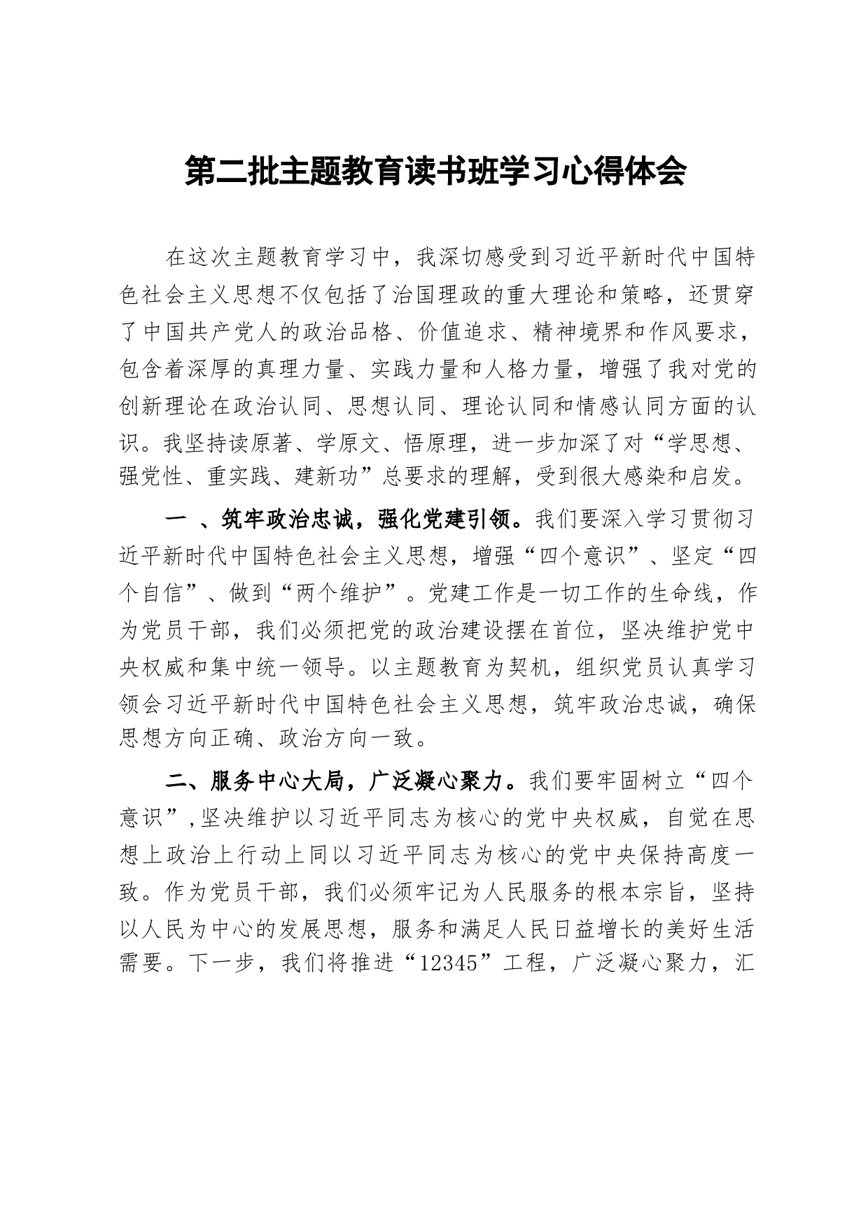 第二批主題教育讀書(shū)班學(xué)習(xí)心得體會(huì)在這次主題教育學(xué)習(xí)中,我深切感受到習(xí)近平新時(shí)代中國(guó)特色社會(huì)主義思想不僅包括了治國(guó)理政的重大理論和策略,還貫穿了中國(guó)共產(chǎn)黨人的政治品格、價(jià)值追求、精神境界和作風(fēng)要求,包含著深厚的真理力量、實(shí)踐力量和人格力量,增強(qiáng)了我對(duì)黨的創(chuàng)新理論在政治認(rèn)同、思想認(rèn)同、理論認(rèn)同和情感認(rèn)同方面的認(rèn)識(shí)。我堅(jiān)持讀原著、學(xué)原文、悟原理,進(jìn)一步加深了對(duì)“學(xué)思想、強(qiáng)黨性、重實(shí)踐、建新功”總要求的理解,受到很大感染和啟發(fā)。一、筑牢政治忠誠(chéng),強(qiáng)化黨建引領(lǐng)。我們要深入學(xué)習(xí)貫徹習(xí)近平新時(shí)代中國(guó)特色社會(huì)主義思想,增強(qiáng)“四個(gè)意識(shí)”、堅(jiān)定...