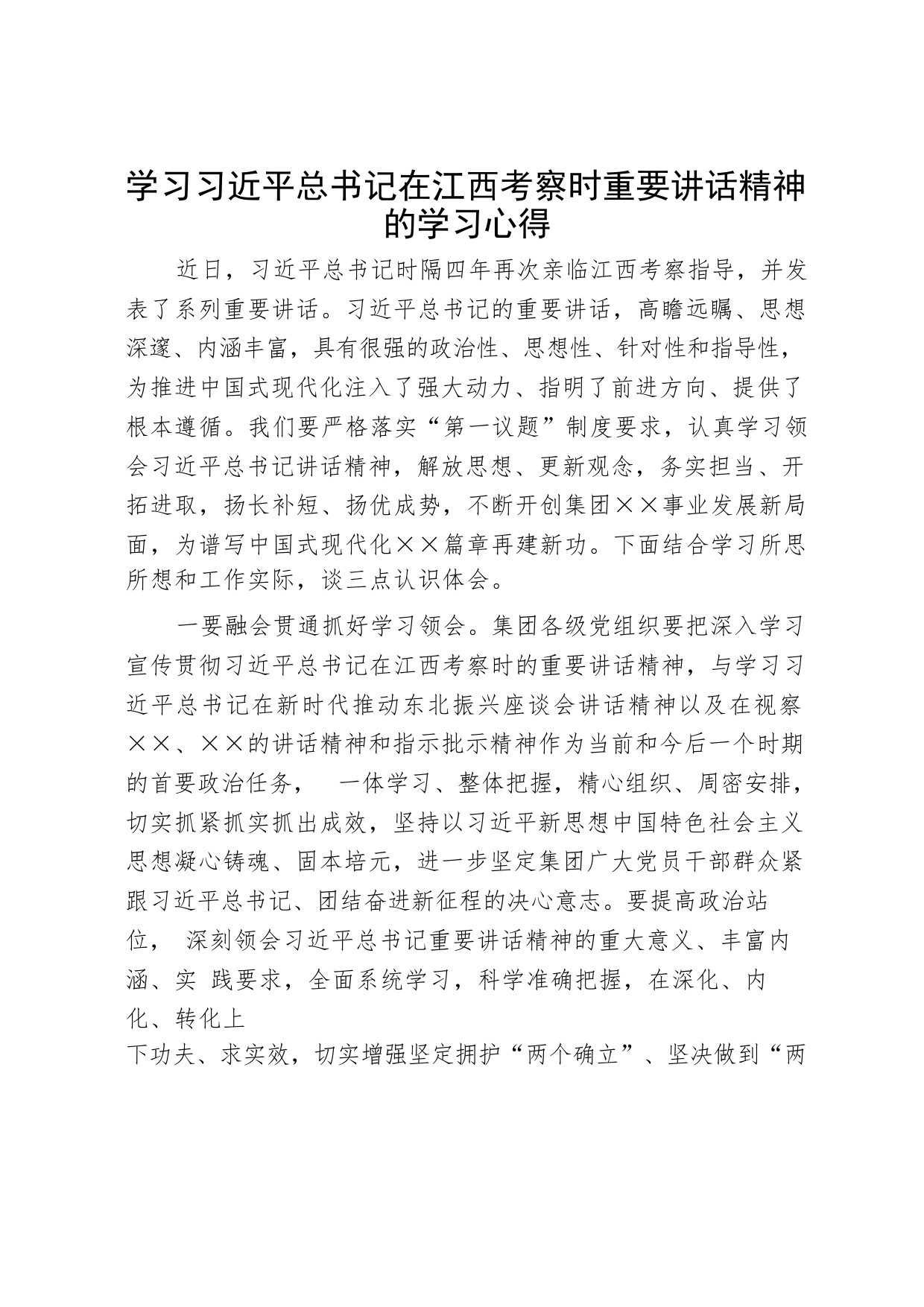 學(xué)習(xí)習(xí)近平總書記在江西考察時(shí)重要講話精神的學(xué)習(xí)心得近日,習(xí)近平總書記時(shí)隔四年再次親臨江西考察指導(dǎo),并發(fā)表了系列重要講話。習(xí)近平總書記的重要講話,高瞻遠(yuǎn)矚、思想深邃、內(nèi)涵豐富,具有很強(qiáng)的政治性、思想性、針對(duì)性和指導(dǎo)性,為推進(jìn)中國(guó)式現(xiàn)代化注入了強(qiáng)大動(dòng)力、指明了前進(jìn)方向、提供了根本遵循。我們要嚴(yán)格落實(shí)“第一議題”制度要求,認(rèn)真學(xué)習(xí)領(lǐng)會(huì)習(xí)近平總書記講話精神,解放思想、更新觀念,務(wù)實(shí)擔(dān)當(dāng)、開拓進(jìn)取,揚(yáng)長(zhǎng)補(bǔ)短、揚(yáng)優(yōu)成勢(shì),不斷開創(chuàng)集團(tuán)××事業(yè)發(fā)展新局面,為譜寫中國(guó)式現(xiàn)代化××篇章再建新功。下面結(jié)合學(xué)習(xí)所思所想和工作實(shí)際,談三點(diǎn)認(rèn)識(shí)體會(huì)。一...