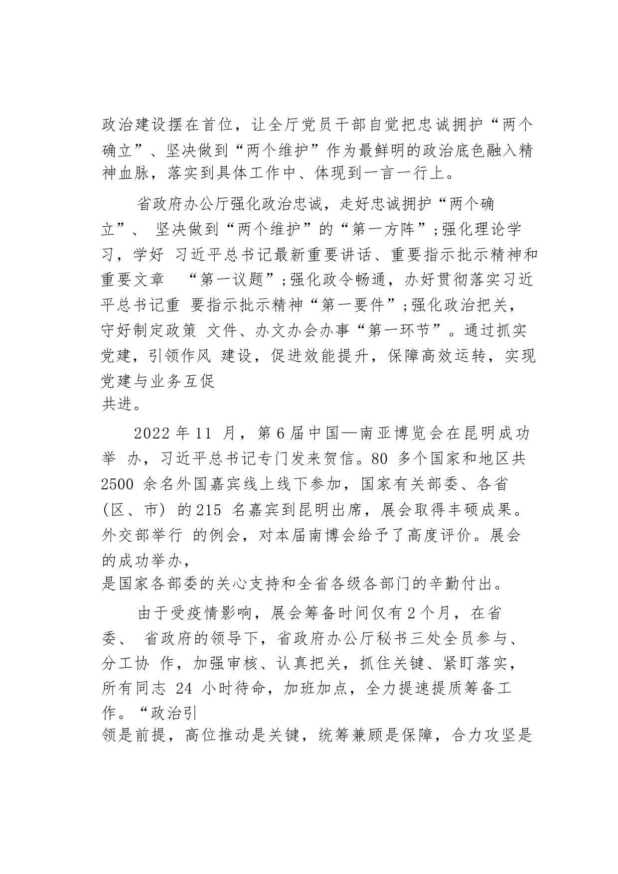 辦公室黨建工作經(jīng)驗(yàn)交流材料:深入開展“四講”活動(dòng),堅(jiān)持典型引領(lǐng)打造模范機(jī)關(guān)“尊重是靠努力贏來的、信任是靠拼搏爭取來的。”“辦公廳工作無小事,事事連政治、事事關(guān)大局?!薄皥?jiān)決把講政治融入一言一行,貫穿到每一篇文稿、每一項(xiàng)活動(dòng)、每一場會(huì)議中?!辈痪们埃谑≌k公廳深化作風(fēng)革命效能革命第5次工作推進(jìn)會(huì)上,8位干部職工走上講臺(tái)作交流發(fā)言。他們當(dāng)中,有工作成效突出的,有主動(dòng)擔(dān)當(dāng)作為的,有默默無聞奉獻(xiàn)的,也有改進(jìn)提升明顯的。大家結(jié)合自身經(jīng)歷,談經(jīng)驗(yàn)、說教訓(xùn)、話感受、講體會(huì),推動(dòng)全廳系統(tǒng)形成“人人爭先鋒、事事爭一流”的良好氛圍。省政府辦公...