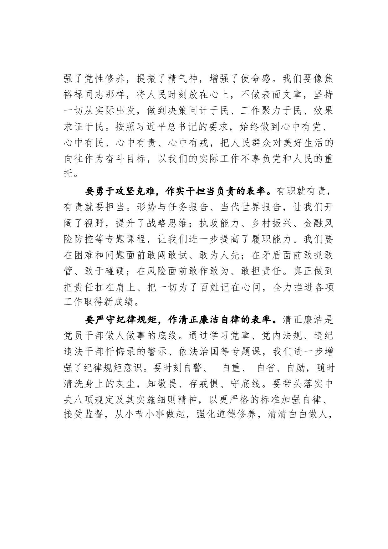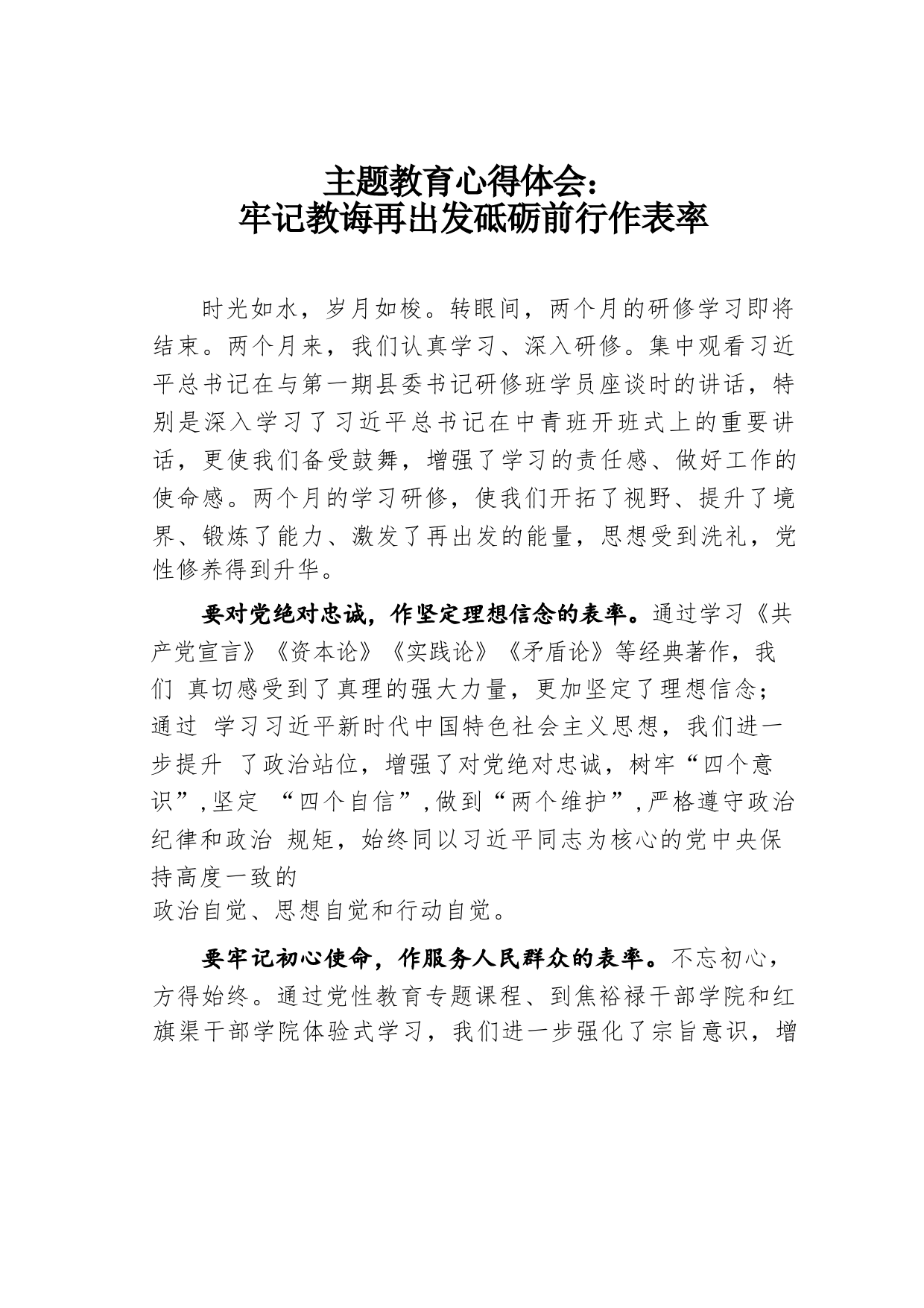 主題教育心得體會:牢記教誨再出發(fā)砥礪前行作表率時光如水,歲月如梭。轉(zhuǎn)眼間,兩個月的研修學(xué)習(xí)即將結(jié)束。兩個月來,我們認真學(xué)習(xí)、深入研修。集中觀看習(xí)近平總書記在與第一期縣委書記研修班學(xué)員座談時的講話,特別是深入學(xué)習(xí)了習(xí)近平總書記在中青班開班式上的重要講話,更使我們備受鼓舞,增強了學(xué)習(xí)的責(zé)任感、做好工作的使命感。兩個月的學(xué)習(xí)研修,使我們開拓了視野、提升了境界、鍛煉了能力、激發(fā)了再出發(fā)的能量,思想受到洗禮,黨性修養(yǎng)得到升華。要對黨絕對忠誠,作堅定理想信念的表率。通過學(xué)習(xí)《共產(chǎn)黨宣言》《資本論》《實踐論》《矛盾論》等經(jīng)典著作,我們真切...