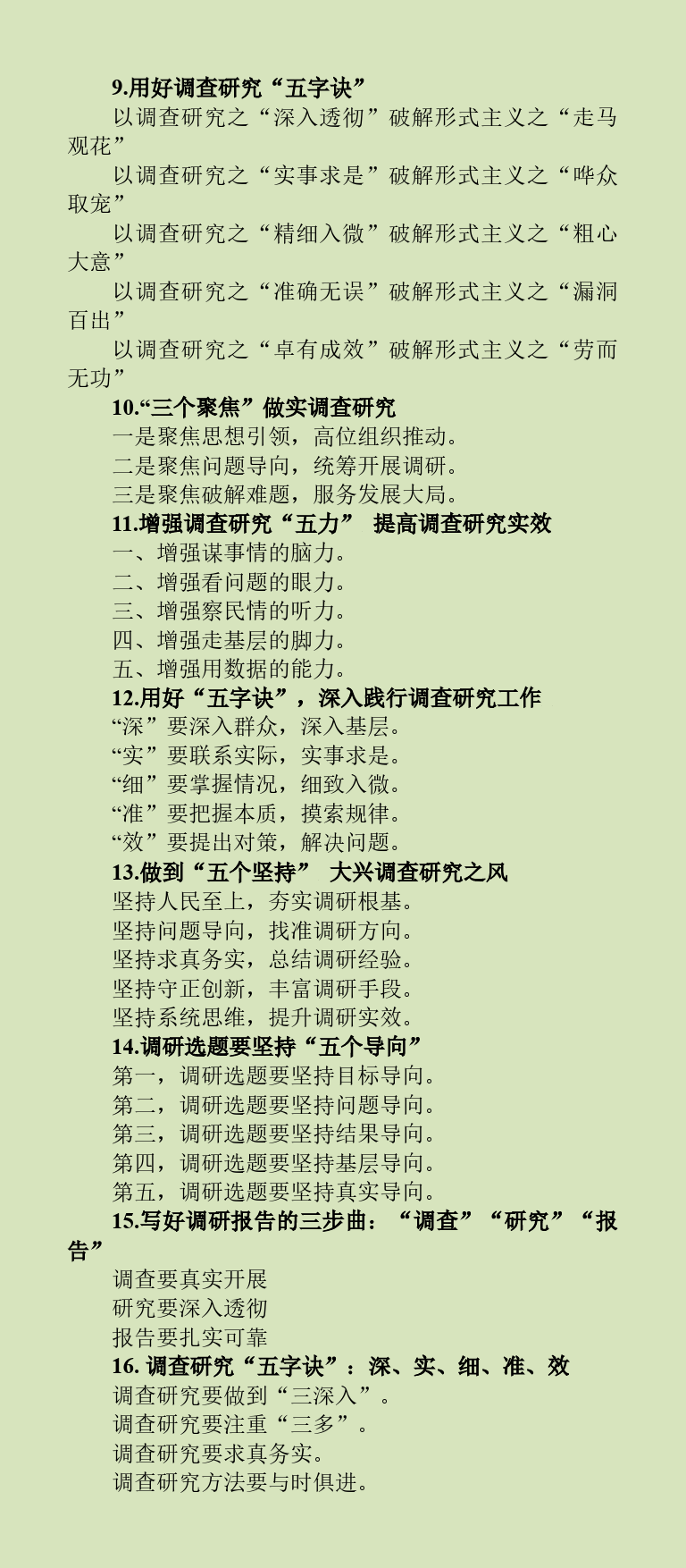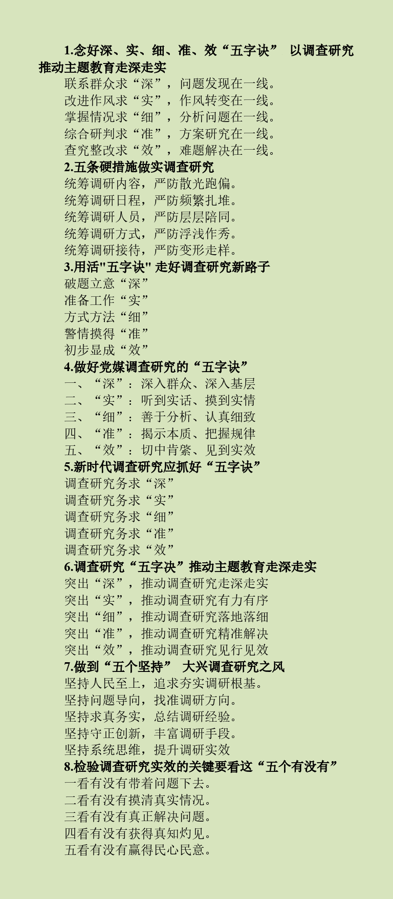 1.念好深、實、細(xì)、準(zhǔn)、效“五字訣”以調(diào)查研究推動主題教育走深走實聯(lián)系群眾求“深”,問題發(fā)現(xiàn)在一線。改進(jìn)作風(fēng)求“實”,作風(fēng)轉(zhuǎn)變在一線。掌握情況求“細(xì)”,分析問題在一線。綜合研判求“準(zhǔn)”,方案研究在一線。查究整改求“效”,難題解決在一線。2.五條硬措施做實調(diào)查研究統(tǒng)籌調(diào)研內(nèi)容,嚴(yán)防散光跑偏。統(tǒng)籌調(diào)研日程,嚴(yán)防頻繁扎堆。統(tǒng)籌調(diào)研人員,嚴(yán)防層層陪同。統(tǒng)籌調(diào)研方式,嚴(yán)防浮淺作秀。統(tǒng)籌調(diào)研接待,嚴(yán)防變形走樣。3.用活"五字訣"走好調(diào)查研究新路子破題立意“深”準(zhǔn)備工作“實”方式方法“細(xì)”警情摸得“準(zhǔn)”初步顯成“效”4.做好黨媒調(diào)查研究的“五字訣”...
