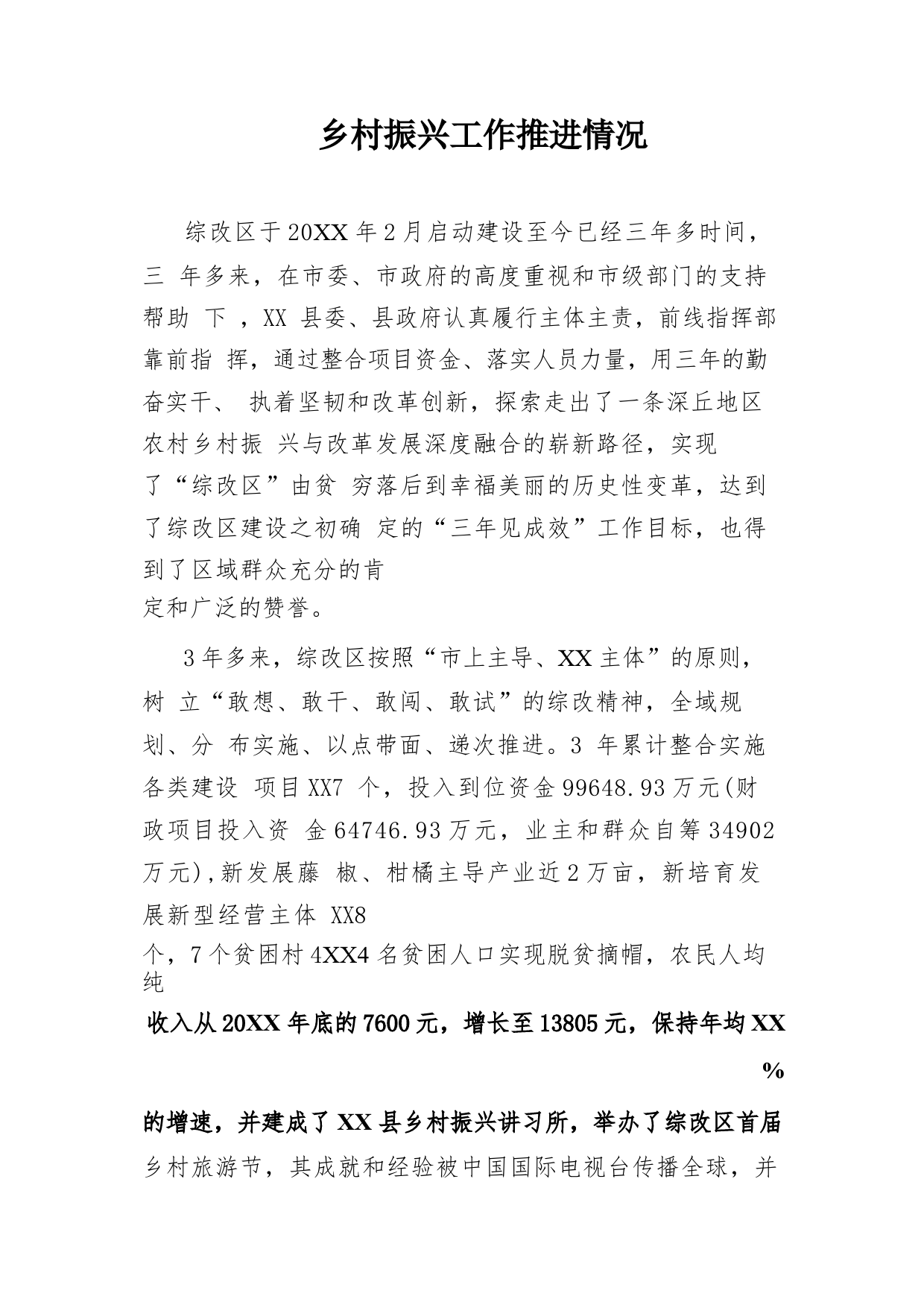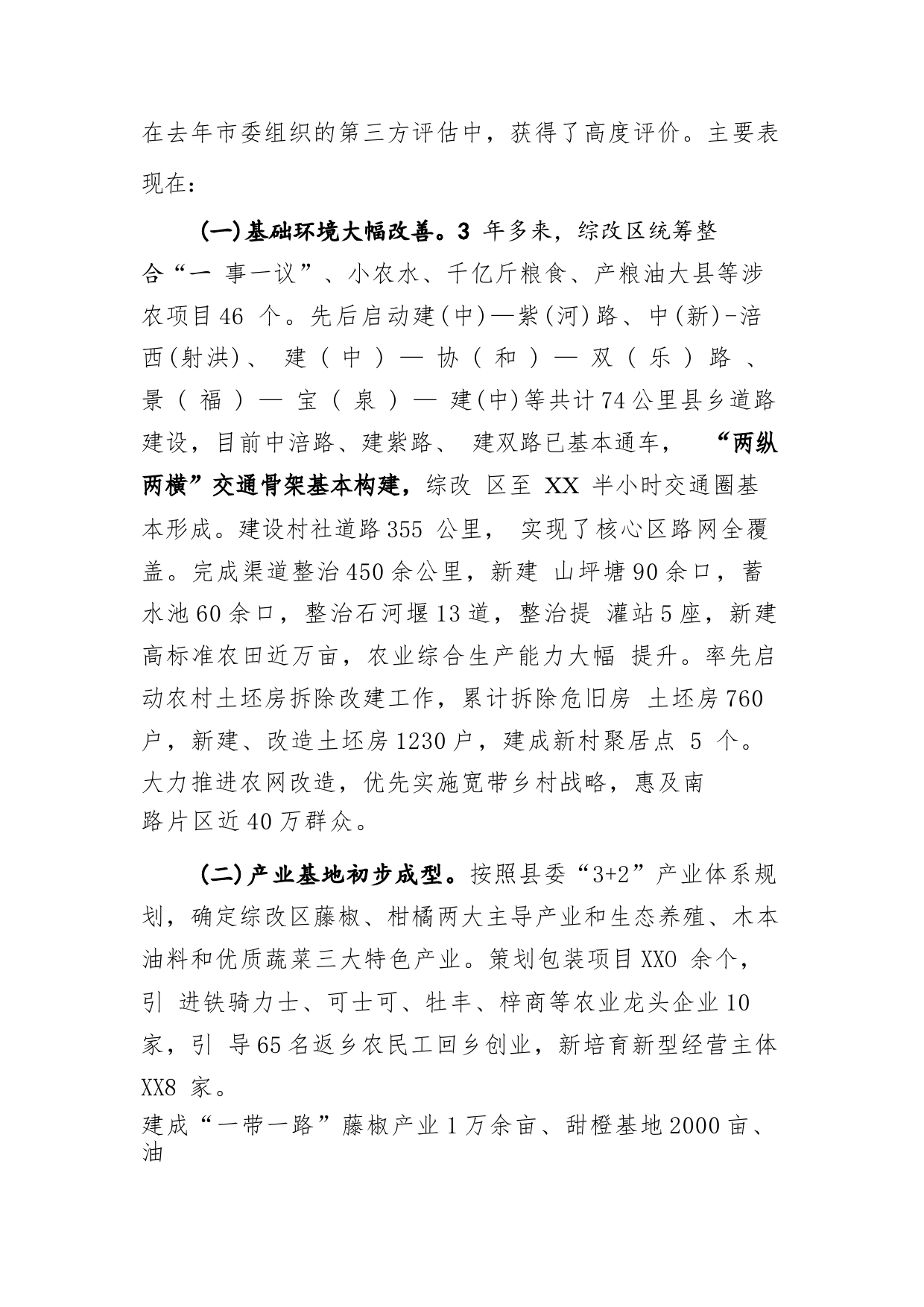 鄉(xiāng)村振興工作推進(jìn)情況綜改區(qū)于20XX年2月啟動(dòng)建設(shè)至今已經(jīng)三年多時(shí)間,三年多來,在市委、市政府的高度重視和市級部門的支持幫助下,XX縣委、縣政府認(rèn)真履行主體主責(zé),前線指揮部靠前指揮,通過整合項(xiàng)目資金、落實(shí)人員力量,用三年的勤奮實(shí)干、執(zhí)著堅(jiān)韌和改革創(chuàng)新,探索走出了一條深丘地區(qū)農(nóng)村鄉(xiāng)村振興與改革發(fā)展深度融合的嶄新路徑,實(shí)現(xiàn)了“綜改區(qū)”由貧窮落后到幸福美麗的歷史性變革,達(dá)到了綜改區(qū)建設(shè)之初確定的“三年見成效”工作目標(biāo),也得到了區(qū)域群眾充分的肯定和廣泛的贊譽(yù)。3年多來,綜改區(qū)按照“市上主導(dǎo)、XX主體”的原則,樹立“敢想、敢干、敢闖、敢試”的綜...