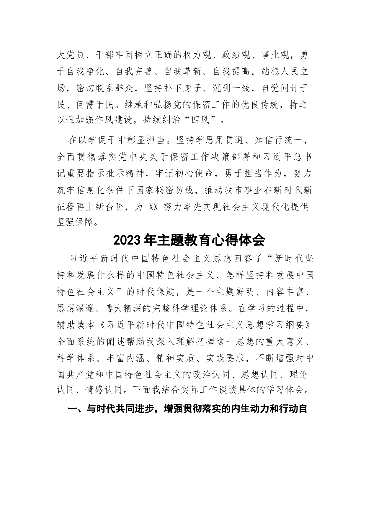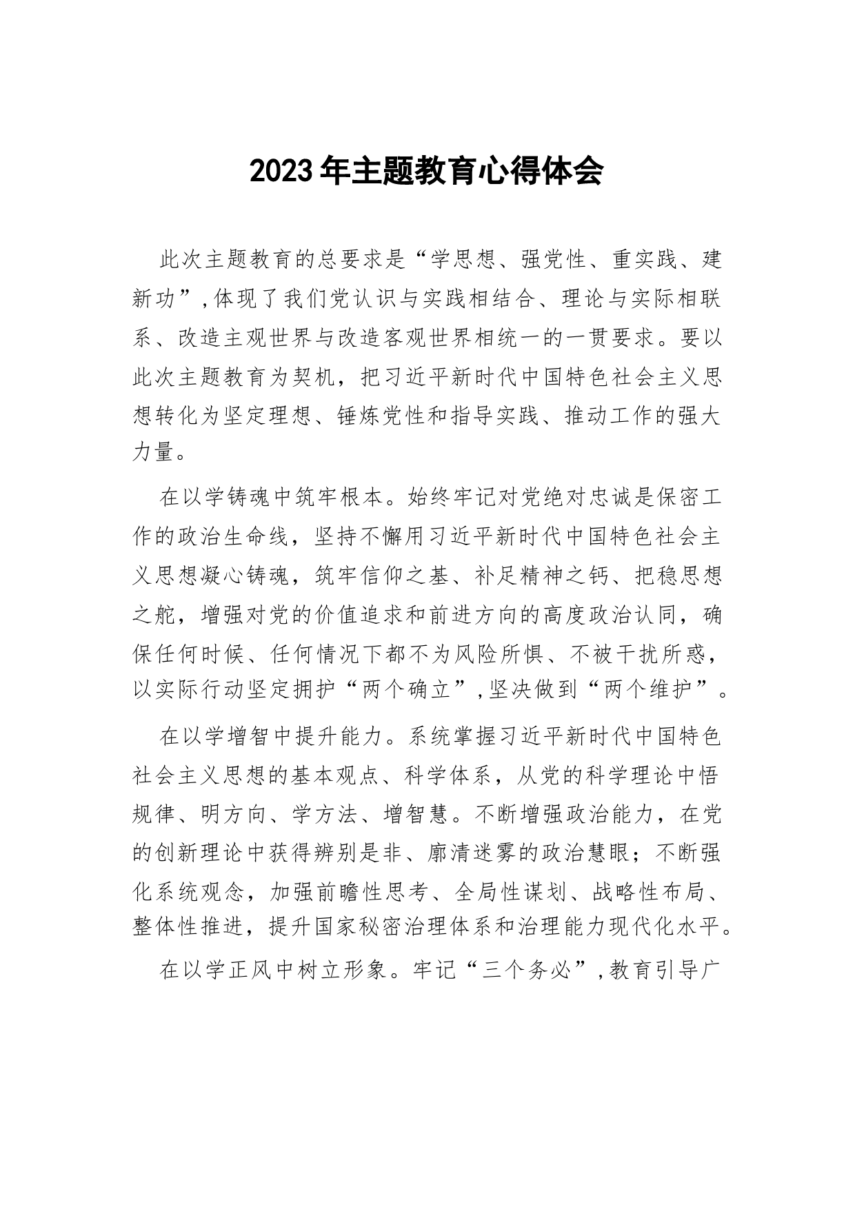 2023年主題教育心得體會(huì)此次主題教育的總要求是“學(xué)思想、強(qiáng)黨性、重實(shí)踐、建新功”,體現(xiàn)了我們黨認(rèn)識(shí)與實(shí)踐相結(jié)合、理論與實(shí)際相聯(lián)系、改造主觀世界與改造客觀世界相統(tǒng)一的一貫要求。要以此次主題教育為契機(jī),把習(xí)近平新時(shí)代中國(guó)特色社會(huì)主義思想轉(zhuǎn)化為堅(jiān)定理想、錘煉黨性和指導(dǎo)實(shí)踐、推動(dòng)工作的強(qiáng)大力量。在以學(xué)鑄魂中筑牢根本。始終牢記對(duì)黨絕對(duì)忠誠(chéng)是保密工作的政治生命線,堅(jiān)持不懈用習(xí)近平新時(shí)代中國(guó)特色社會(huì)主義思想凝心鑄魂,筑牢信仰之基、補(bǔ)足精神之鈣、把穩(wěn)思想之舵,增強(qiáng)對(duì)黨的價(jià)值追求和前進(jìn)方向的高度政治認(rèn)同,確保任何時(shí)候、任何情況下都不為風(fēng)險(xiǎn)所懼、...