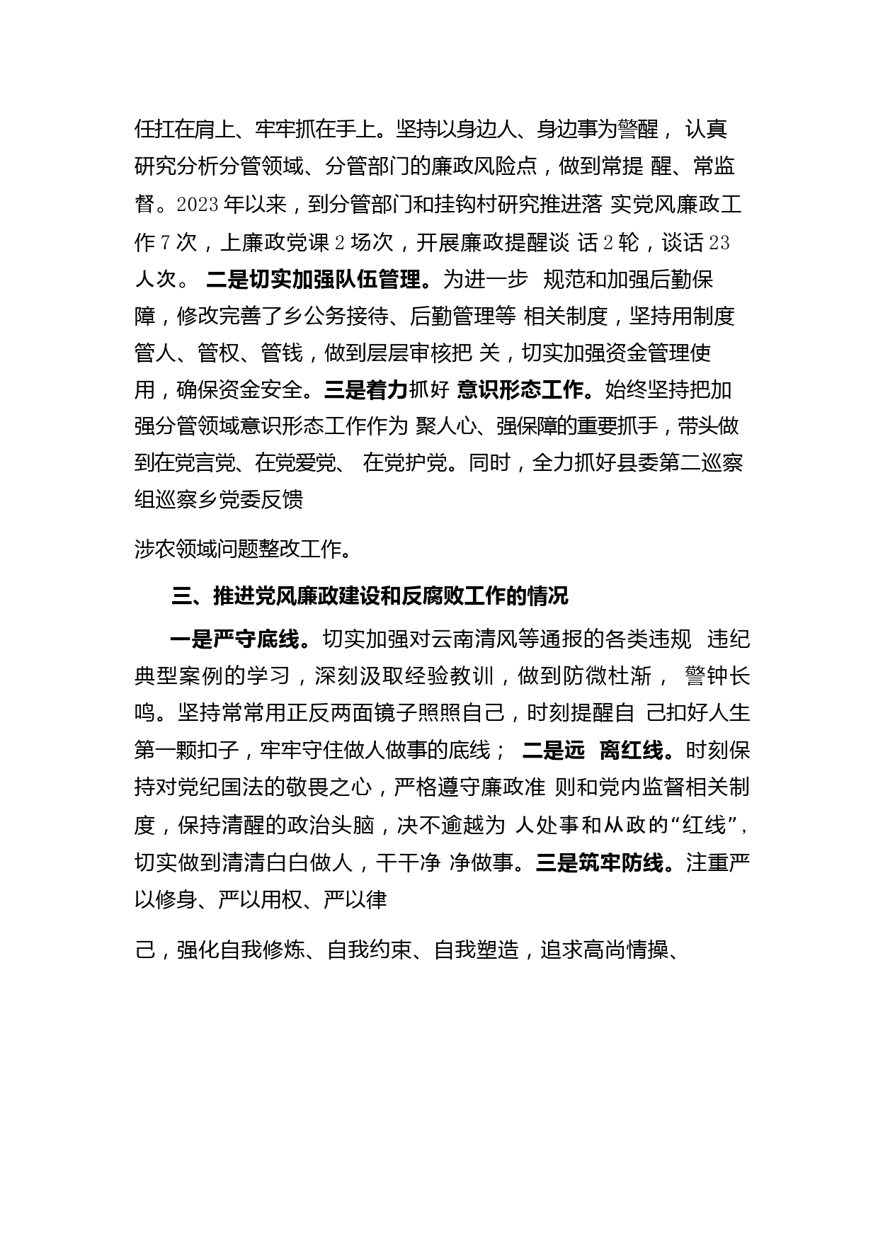 鄉(xiāng)黨委班子成員2023年度個(gè)人述責(zé)述廉報(bào)告考核組各位領(lǐng)導(dǎo):現(xiàn)將2023年度落實(shí)黨風(fēng)廉政建設(shè)責(zé)任制情況報(bào)告如下,不妥之處,敬請批評指正:一、執(zhí)行政治紀(jì)律和政治規(guī)矩的情況一是保持思想同心。堅(jiān)持以習(xí)近平新時(shí)代中國特色社會主義思想為指導(dǎo),樹牢“四個(gè)意識”堅(jiān)定“四個(gè)自信”,忠誠擁護(hù)“兩個(gè)確立”,充分認(rèn)識守紀(jì)律、講規(guī)矩的極端重要性,以強(qiáng)烈的政治責(zé)任感、使命感,始終在思想上政治上行動上與以習(xí)近平同志為核心的黨中央保持高度一致。二是保持目標(biāo)同向。一年來,我系統(tǒng)學(xué)習(xí)了黨的二十大、習(xí)近平總書記考察云南重要講話精神和中央、省、市、縣紀(jì)委全會精神,時(shí)刻堅(jiān)持把...