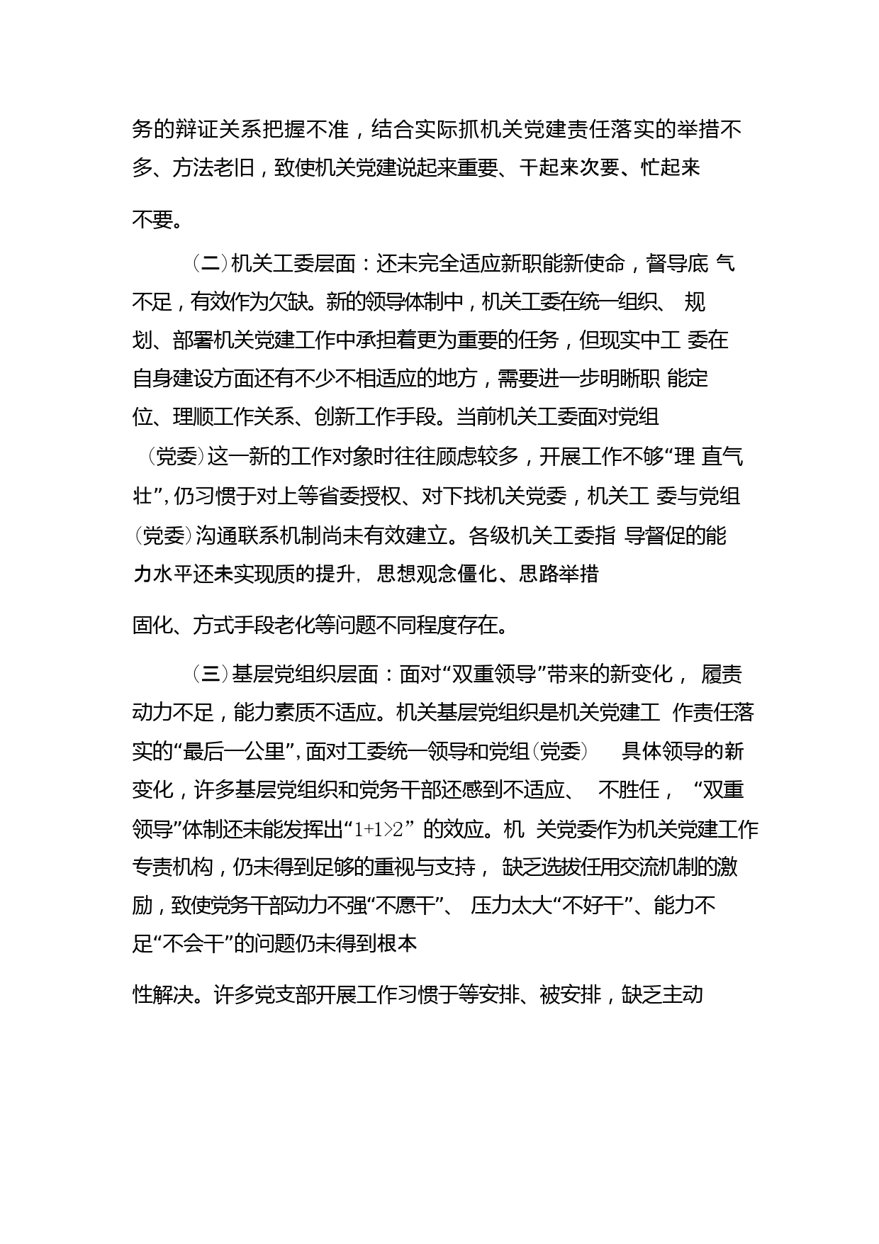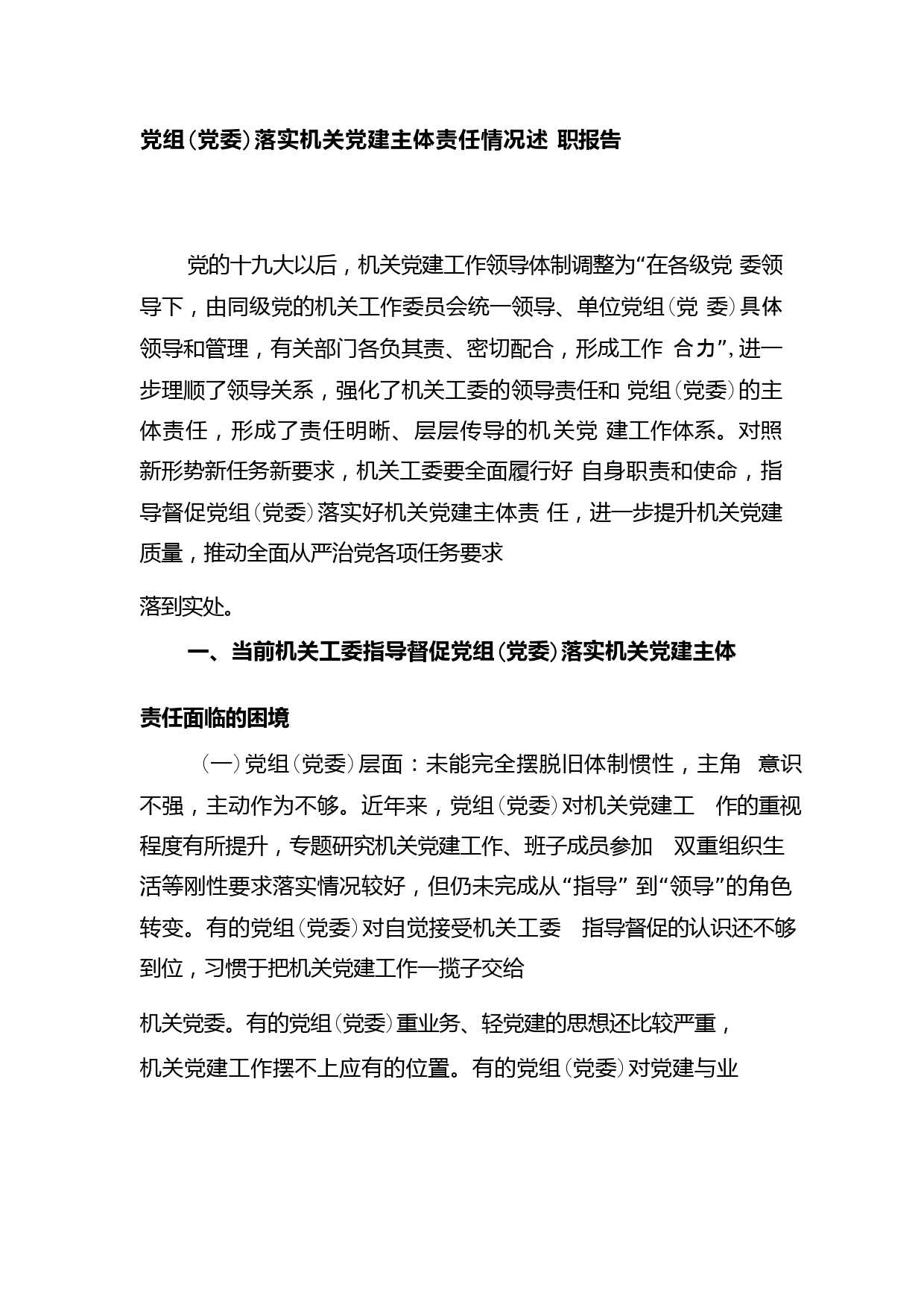 黨組(黨委)落實機關(guān)黨建主體責(zé)任情況述職報告黨的十九大以后,機關(guān)黨建工作領(lǐng)導(dǎo)體制調(diào)整為“在各級黨委領(lǐng)導(dǎo)下,由同級黨的機關(guān)工作委員會統(tǒng)一領(lǐng)導(dǎo)、單位黨組(黨委)具體領(lǐng)導(dǎo)和管理,有關(guān)部門各負(fù)其責(zé)、密切配合,形成工作合力”,進(jìn)一步理順了領(lǐng)導(dǎo)關(guān)系,強化了機關(guān)工委的領(lǐng)導(dǎo)責(zé)任和黨組(黨委)的主體責(zé)任,形成了責(zé)任明晰、層層傳導(dǎo)的機關(guān)黨建工作體系。對照新形勢新任務(wù)新要求,機關(guān)工委要全面履行好自身職責(zé)和使命,指導(dǎo)督促黨組(黨委)落實好機關(guān)黨建主體責(zé)任,進(jìn)一步提升機關(guān)黨建質(zhì)量,推動全面從嚴(yán)治黨各項任務(wù)要求落到實處。一、當(dāng)前機關(guān)工委指導(dǎo)督促黨組(黨委)落實機...