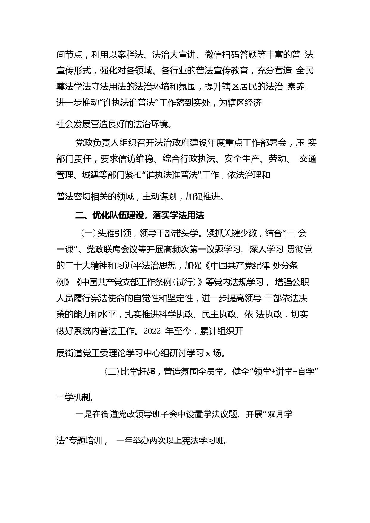2篇2023年“誰執(zhí)法誰普法”工作自評(píng)報(bào)告2023年“誰執(zhí)法誰普法”工作自評(píng)報(bào)告xx街道在區(qū)委、區(qū)政府正確領(lǐng)導(dǎo)和區(qū)普法辦指導(dǎo)下,全面貫徹習(xí)近平新時(shí)代中國(guó)特色社會(huì)主義思想和黨的二十大精神,深入貫徹落實(shí)中央和省、市、區(qū)“八五”普法規(guī)劃部署和國(guó)家機(jī)關(guān)“誰執(zhí)法誰普法”普法責(zé)任制工作部署,根據(jù)《xx省國(guó)家機(jī)關(guān)“誰執(zhí)法誰普法”履職報(bào)告評(píng)議活動(dòng)實(shí)施辦法》,切實(shí)履行普法主體責(zé)任,穩(wěn)步推進(jìn)依法治理和法治宣傳進(jìn)程,現(xiàn)將有關(guān)情況匯報(bào)如下:一、加強(qiáng)組織領(lǐng)導(dǎo),完善機(jī)制建設(shè)(一)統(tǒng)籌全局,完善制度規(guī)范。一是嚴(yán)格黨政主要負(fù)責(zé)人推進(jìn)法治建設(shè)第一責(zé)任人職責(zé),成立街道全面依法...