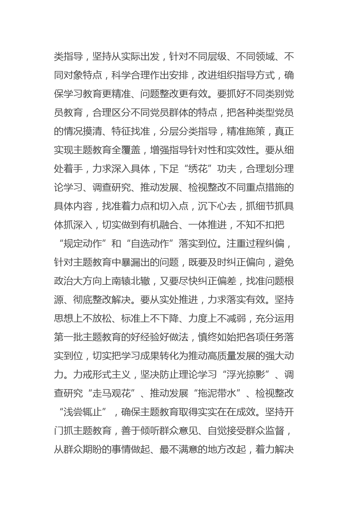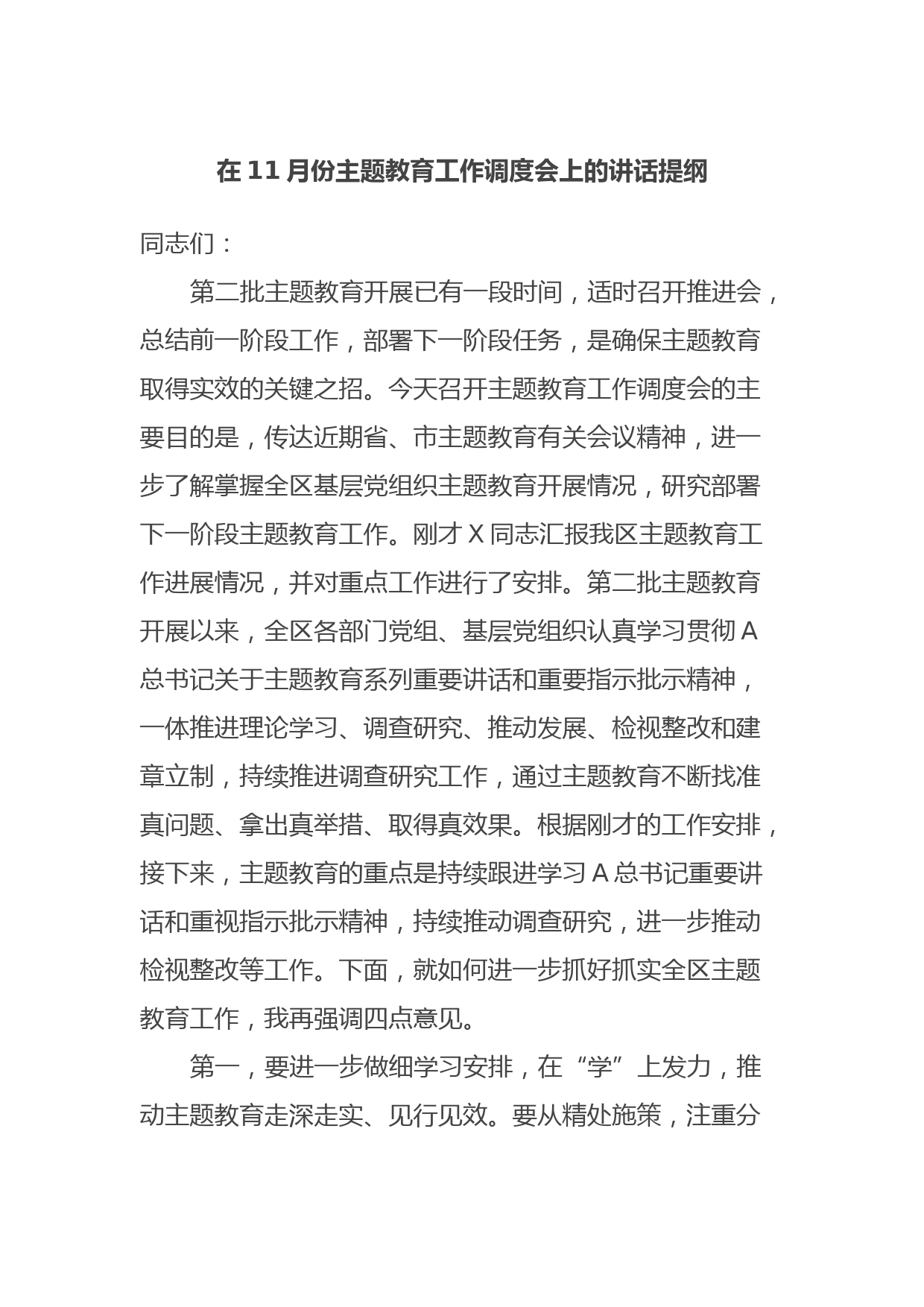 在11月份主題教育工作調(diào)度會(huì)上的講話提綱同志們:第二批主題教育開展已有一段時(shí)間,適時(shí)召開推進(jìn)會(huì),總結(jié)前一階段工作,部署下一階段任務(wù),是確保主題教育取得實(shí)效的關(guān)鍵之招。今天召開主題教育工作調(diào)度會(huì)的主要目的是,傳達(dá)近期省、市主題教育有關(guān)會(huì)議精神,進(jìn)一步了解掌握全區(qū)基層黨組織主題教育開展情況,研究部署下一階段主題教育工作。剛才X同志匯報(bào)我區(qū)主題教育工作進(jìn)展情況,并對(duì)重點(diǎn)工作進(jìn)行了安排。第二批主題教育開展以來(lái),全區(qū)各部門黨組、基層黨組織認(rèn)真學(xué)習(xí)貫徹A總書記關(guān)于主題教育系列重要講話和重要指示批示精神,一體推進(jìn)理論學(xué)習(xí)、調(diào)查研究、推動(dòng)發(fā)展、...