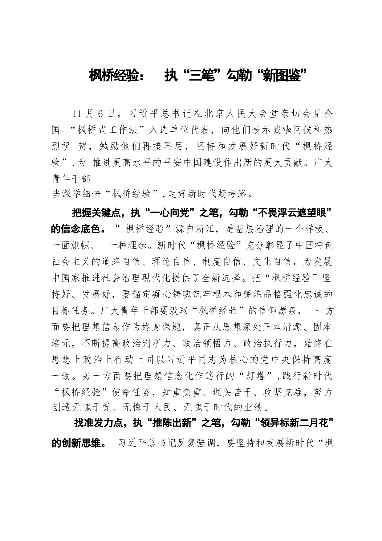 楓橋經(jīng)驗(yàn):執(zhí)“三筆”勾勒“新圖鑒”11月6日,習(xí)近平總書記在北京人民大會(huì)堂親切會(huì)見全國(guó)“楓橋式工作法”入選單位代表,向他們表示誠(chéng)摯問候和熱烈祝賀,勉勵(lì)他們?cè)俳釉賲?,?jiān)持和發(fā)展好新時(shí)代“楓橋經(jīng)驗(yàn)”,為推進(jìn)更高水平的平安中國(guó)建設(shè)作出新的更大貢獻(xiàn)。廣大青年干部當(dāng)深學(xué)細(xì)悟“楓橋經(jīng)驗(yàn)”,走好新時(shí)代趕考路。把握關(guān)鍵點(diǎn),執(zhí)“一心向黨”之筆,勾勒“不畏浮云遮望眼”的信念底色?!皸鳂蚪?jīng)驗(yàn)”源自浙江,是基層治理的一個(gè)樣板、一面旗幟、一種理念。新時(shí)代“楓橋經(jīng)驗(yàn)”充分彰顯了中國(guó)特色社會(huì)主義的道路自信、理論自信、制度自信、文化自信,為發(fā)展中國(guó)家推進(jìn)社會(huì)治...