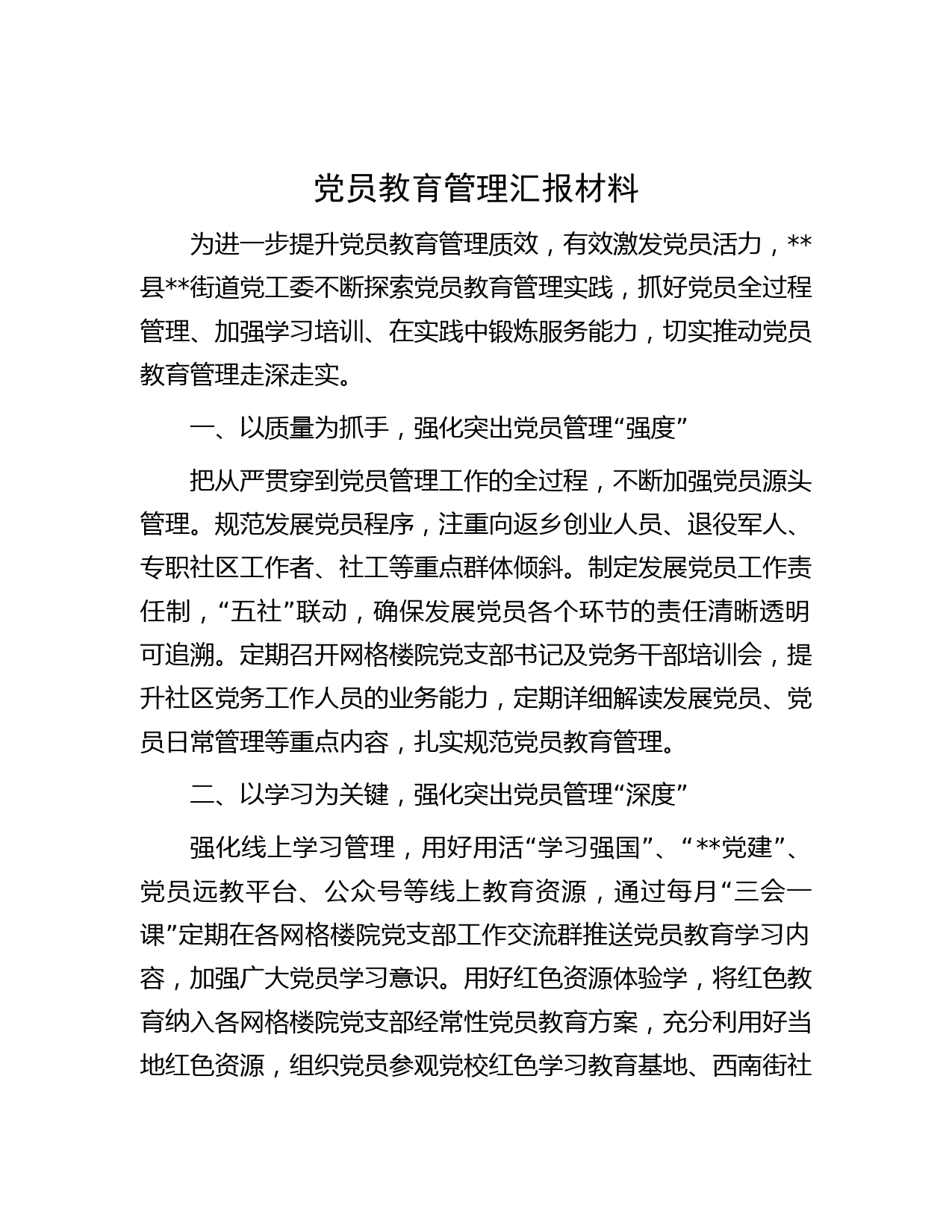 黨員教育管理匯報材料為進一步提升黨員教育管理質(zhì)效,有效激發(fā)黨員活力,縣街道黨工委不斷探索黨員教育管理實踐,抓好黨員全過程管理、加強學(xué)習(xí)培訓(xùn)、在實踐中鍛煉服務(wù)能力,切實推動黨員教育管理走深走實。一、以質(zhì)量為抓手,強化突出黨員管理“強度”把從嚴(yán)貫穿到黨員管理工作的全過程,不斷加強黨員源頭管理。規(guī)范發(fā)展黨員程序,注重向返鄉(xiāng)創(chuàng)業(yè)人員、退役軍人、專職社區(qū)工作者、社工等重點群體傾斜。制定發(fā)展黨員工作責(zé)任制,“五社”聯(lián)動,確保發(fā)展黨員各個環(huán)節(jié)的責(zé)任清晰透明可追溯。定期召開網(wǎng)格樓院黨支部書記及黨務(wù)干部培訓(xùn)會,提升社區(qū)黨務(wù)工作人員的業(yè)務(wù)能力,...