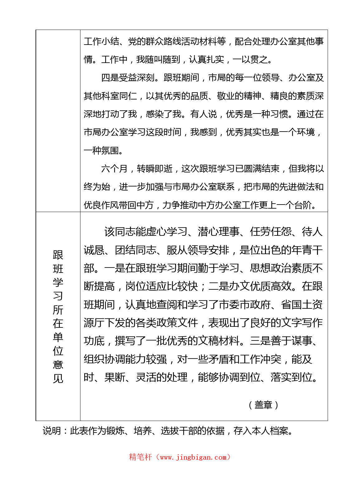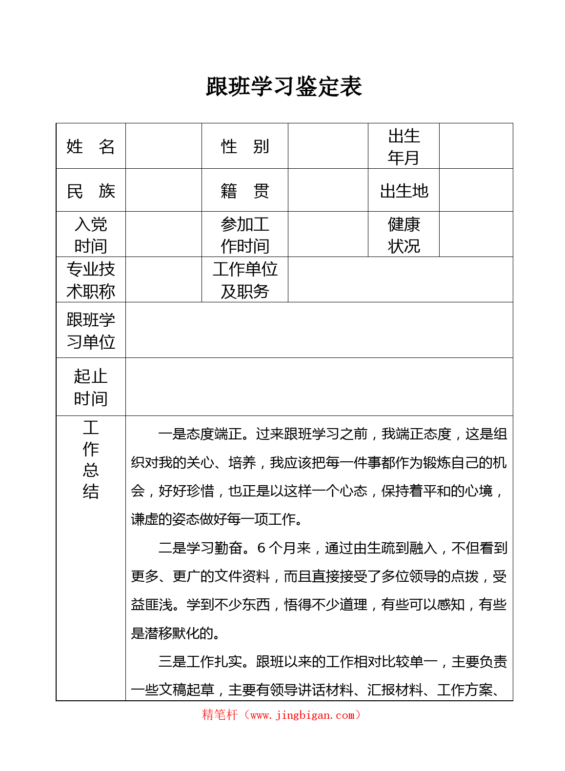 跟班學(xué)習(xí)鑒定表姓名性別出生年月民族籍貫出生地入黨參加工健康時間作時間狀況專業(yè)技工作單位術(shù)職稱及職務(wù)跟班學(xué)習(xí)單位起止一是態(tài)度端正。過來跟班學(xué)習(xí)之前,我端正態(tài)度,這是組時間織對我的關(guān)心、培養(yǎng),我應(yīng)該把每一件事都作為鍛煉自己的機(jī)會,好好珍惜,也正是以這樣一個心態(tài),保持著平和的心境,工謙虛的姿態(tài)做好每一項工作。作總二是學(xué)習(xí)勤奮。6個月來,通過由生疏到融入,不但看到結(jié)更多、更廣的文件資料,而且直接接受了多位領(lǐng)導(dǎo)的點撥,受益匪淺。學(xué)到不少東西,悟得不少道理,有些可以感知,有些是潛移默化的。三是工作扎實。跟班以來的工作相對比較單一,主要負(fù)...