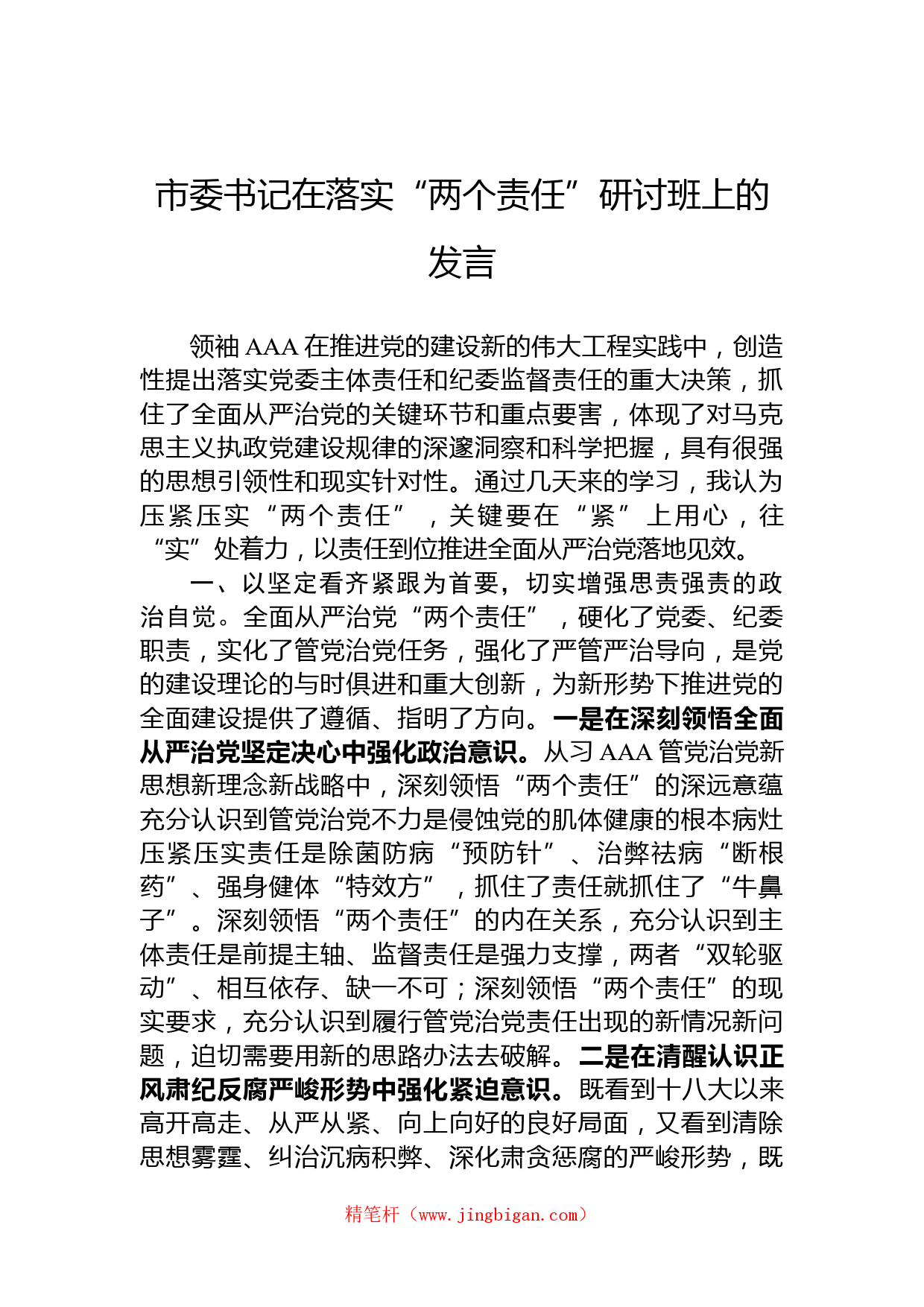 市委書記在落實“兩個責(zé)任”研討班上的發(fā)言VIP免費