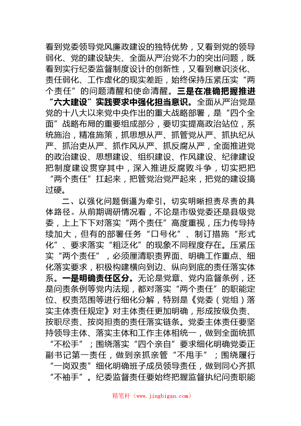 市委書記在落實“兩個責(zé)任”研討班上的發(fā)言領(lǐng)袖AAA在推進(jìn)黨的建設(shè)新的偉大工程實踐中,創(chuàng)造性提出落實黨委主體責(zé)任和紀(jì)委監(jiān)督責(zé)任的重大決策,抓住了全面從嚴(yán)治黨的關(guān)鍵環(huán)節(jié)和重點要害,體現(xiàn)了對馬克思主義執(zhí)政黨建設(shè)規(guī)律的深邃洞察和科學(xué)把握,具有很強的思想引領(lǐng)性和現(xiàn)實針對性。通過幾天來的學(xué)習(xí),我認(rèn)為壓緊壓實“兩個責(zé)任”,關(guān)鍵要在“緊”上用心,往“實”處著力,以責(zé)任到位推進(jìn)全面從嚴(yán)治黨落地見效。一、以堅定看齊緊跟為首要,切實增強思責(zé)強責(zé)的政治自覺。全面從嚴(yán)治黨“兩個責(zé)任”,硬化了黨委、紀(jì)委職責(zé),實化了管黨治黨任務(wù),強化了嚴(yán)管嚴(yán)治導(dǎo)向,是黨的...