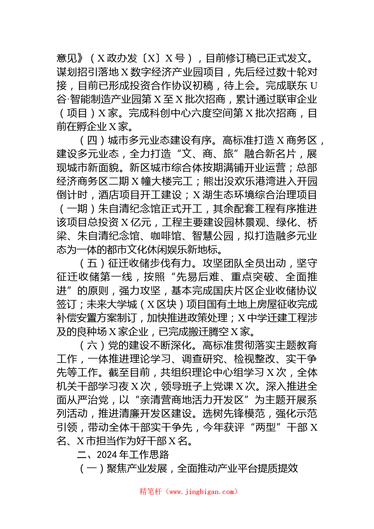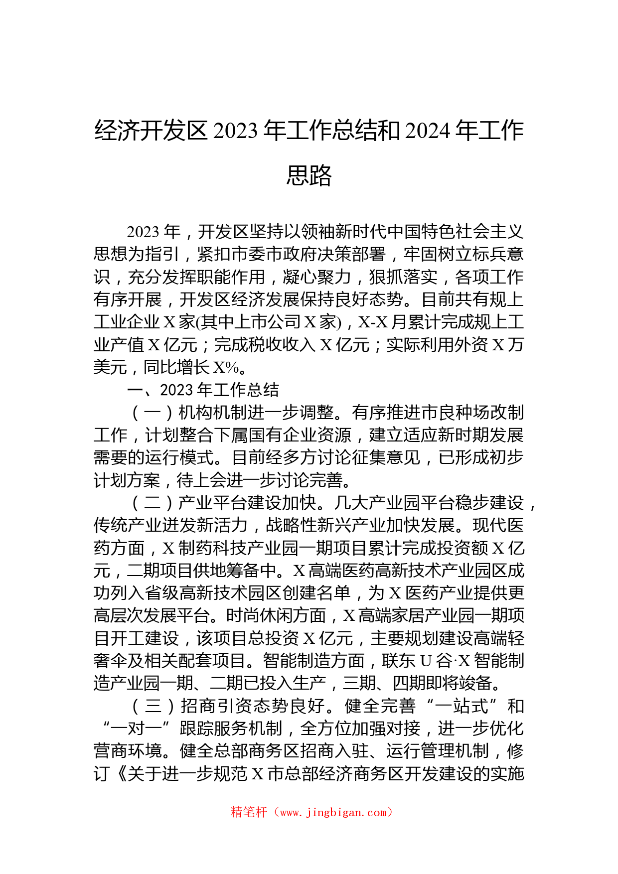 經(jīng)濟(jì)開發(fā)區(qū)2023年工作總結(jié)和2024年工作思路2023年,開發(fā)區(qū)堅持以領(lǐng)袖新時代中國特色社會主義思想為指引,緊扣市委市政府決策部署,牢固樹立標(biāo)兵意識,充分發(fā)揮職能作用,凝心聚力,狠抓落實(shí),各項工作有序開展,開發(fā)區(qū)經(jīng)濟(jì)發(fā)展保持良好態(tài)勢。目前共有規(guī)上工業(yè)企業(yè)X家(其中上市公司X家),X-X月累計完成規(guī)上工業(yè)產(chǎn)值X億元;完成稅收收入X億元;實(shí)際利用外資X萬美元,同比增長X%。一、2023年工作總結(jié)(一)機(jī)構(gòu)機(jī)制進(jìn)一步調(diào)整。有序推進(jìn)市良種場改制工作,計劃整合下屬國有企業(yè)資源,建立適應(yīng)新時期發(fā)展需要的運(yùn)行模式。目前經(jīng)多方討論征集意見,已形成初步計劃方案,待上會...