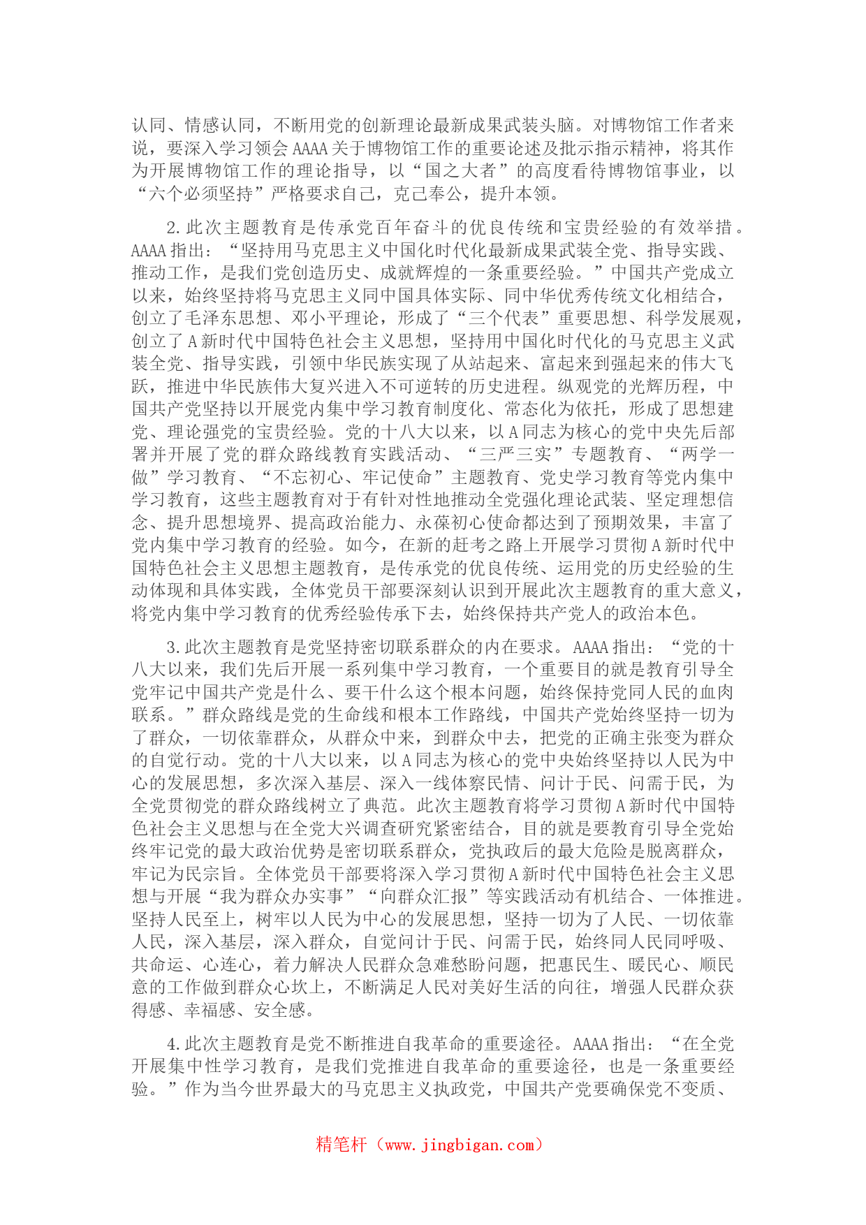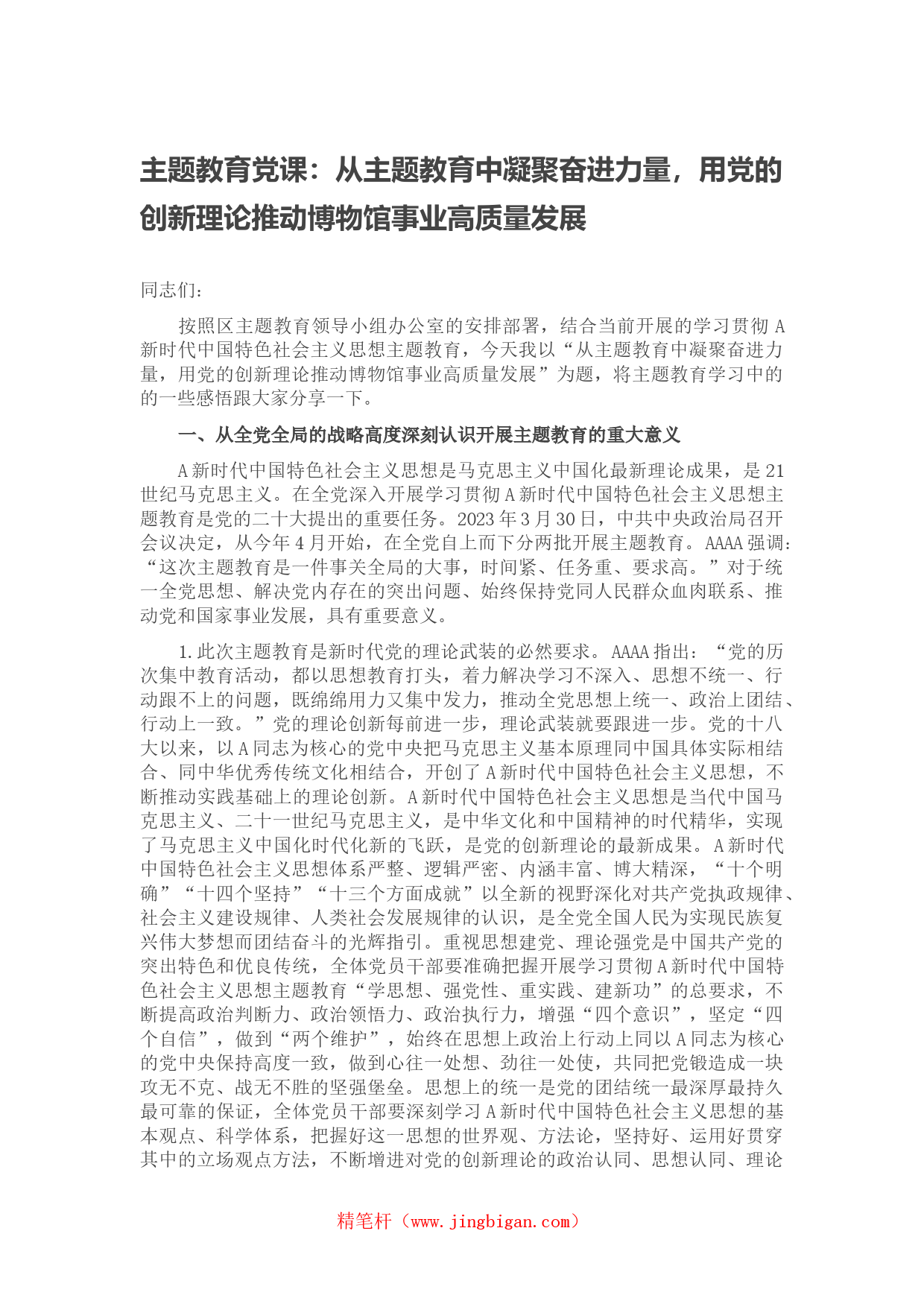 主題教育黨課:從主題教育中凝聚奮進(jìn)力量,用黨的創(chuàng)新理論推動博物館事業(yè)高質(zhì)量發(fā)展同志們:按照區(qū)主題教育領(lǐng)導(dǎo)小組辦公室的安排部署,結(jié)合當(dāng)前開展的學(xué)習(xí)貫徹A新時代中國特色社會主義思想主題教育,今天我以“從主題教育中凝聚奮進(jìn)力量,用黨的創(chuàng)新理論推動博物館事業(yè)高質(zhì)量發(fā)展”為題,將主題教育學(xué)習(xí)中的的一些感悟跟大家分享一下。一、從全黨全局的戰(zhàn)略高度深刻認(rèn)識開展主題教育的重大意義A新時代中國特色社會主義思想是馬克思主義中國化最新理論成果,是21世紀(jì)馬克思主義。在全黨深入開展學(xué)習(xí)貫徹A新時代中國特色社會主義思想主題教育是黨的二十大提出的重要任務(wù)。2...