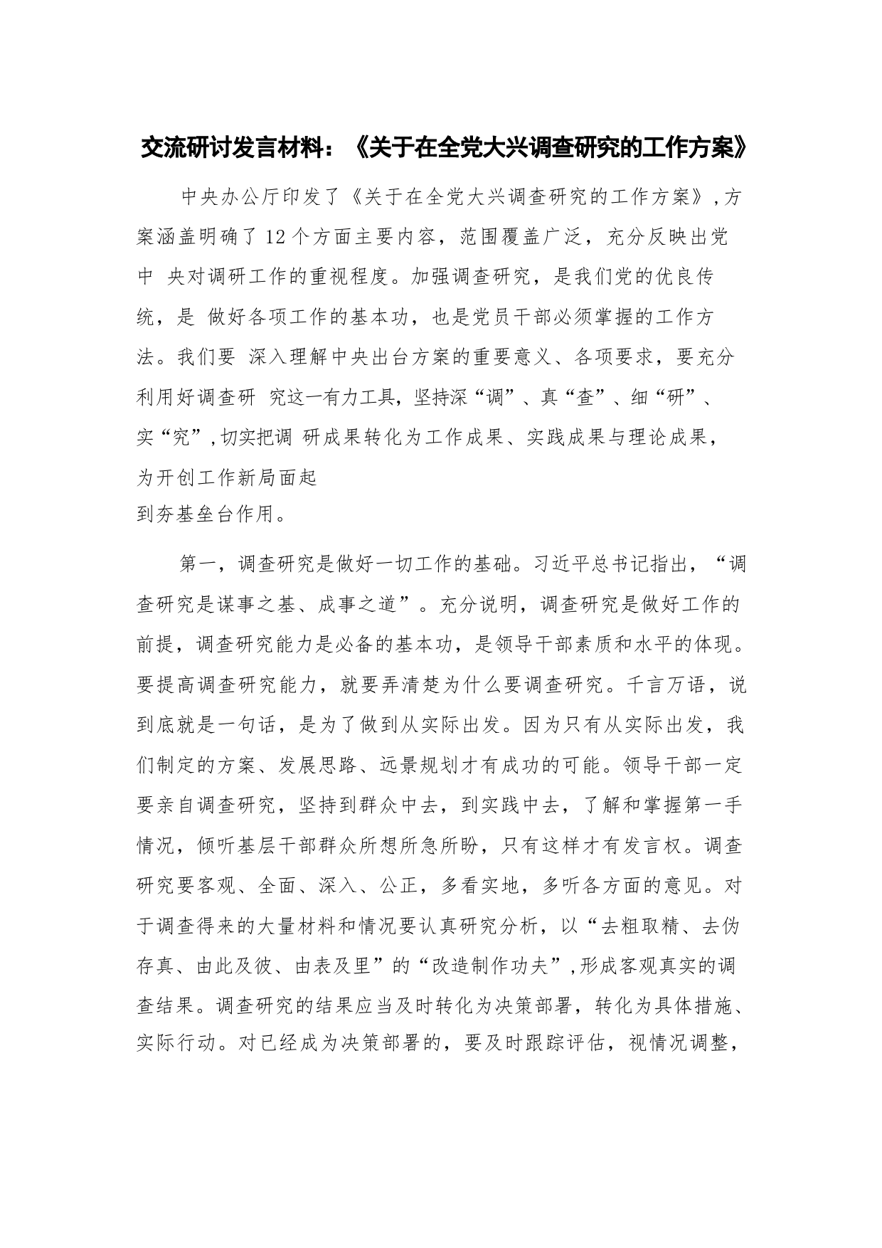 交流研討發(fā)言材料:《關(guān)于在全黨大興調(diào)查研究的工作方案》VIP免費(fèi)