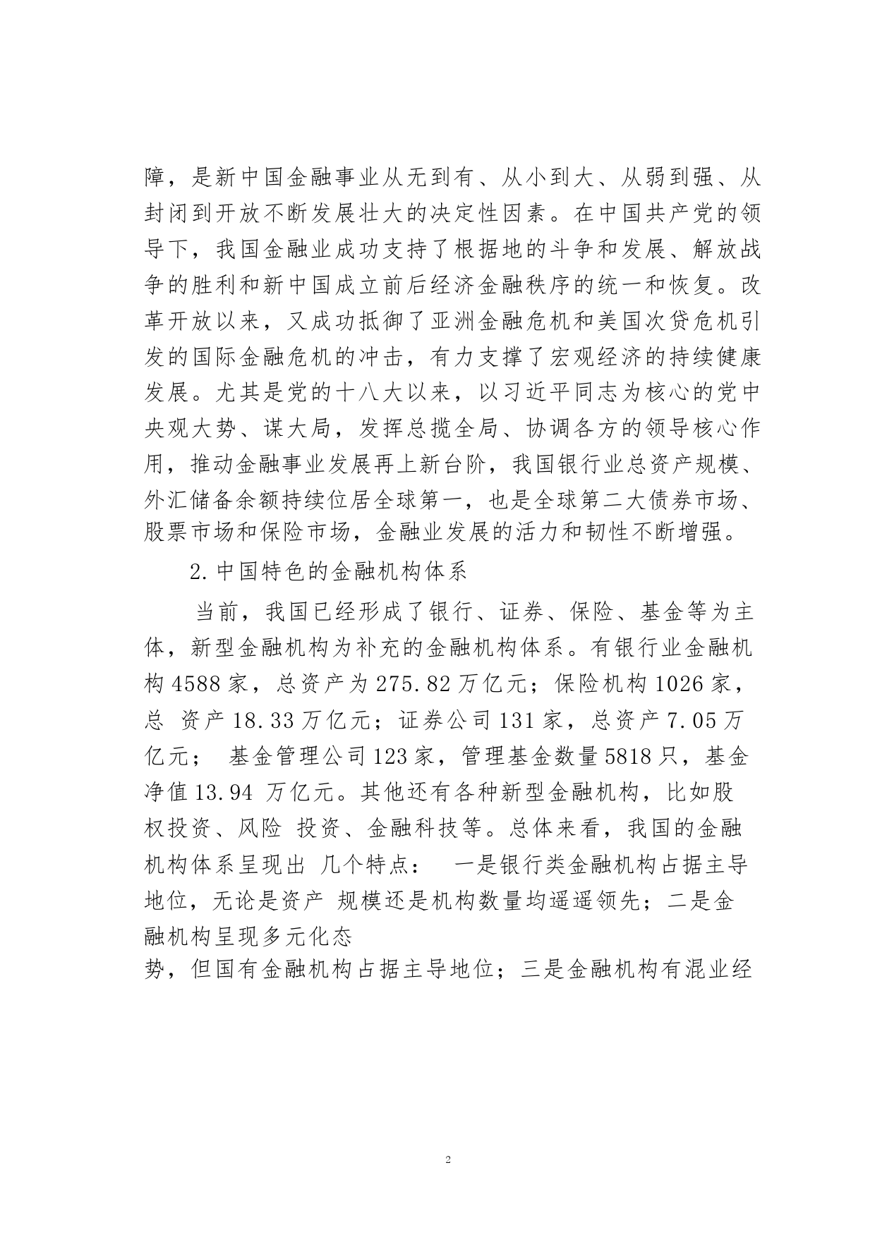 走中國(guó)特色金融發(fā)展之路研討發(fā)言習(xí)近平總書記強(qiáng)調(diào),“金融是國(guó)家重要的核心競(jìng)爭(zhēng)力,金融安全是國(guó)家安全的重要組成部分,金融制度是經(jīng)濟(jì)社會(huì)發(fā)展中重要的基礎(chǔ)性制度”,“我們要深化對(duì)金融本質(zhì)和規(guī)律的認(rèn)識(shí),立足中國(guó)實(shí)際,走出中國(guó)特色金融發(fā)展之路”。當(dāng)前,我國(guó)正在由高速增長(zhǎng)階段邁向高質(zhì)量發(fā)展階段,對(duì)金融工作也提出了更高的要求。進(jìn)一步深化對(duì)金融本質(zhì)和規(guī)律的認(rèn)識(shí),堅(jiān)持走中國(guó)特色金融發(fā)展之路,有助于使金融更好地為實(shí)體經(jīng)濟(jì)服務(wù),不斷滿足經(jīng)濟(jì)社會(huì)發(fā)展和人民群眾需要,推動(dòng)實(shí)現(xiàn)經(jīng)濟(jì)高質(zhì)量發(fā)展。1.堅(jiān)持黨對(duì)金融工作的集中統(tǒng)一領(lǐng)導(dǎo)堅(jiān)持黨對(duì)金融工作的集中統(tǒng)一領(lǐng)導(dǎo)...