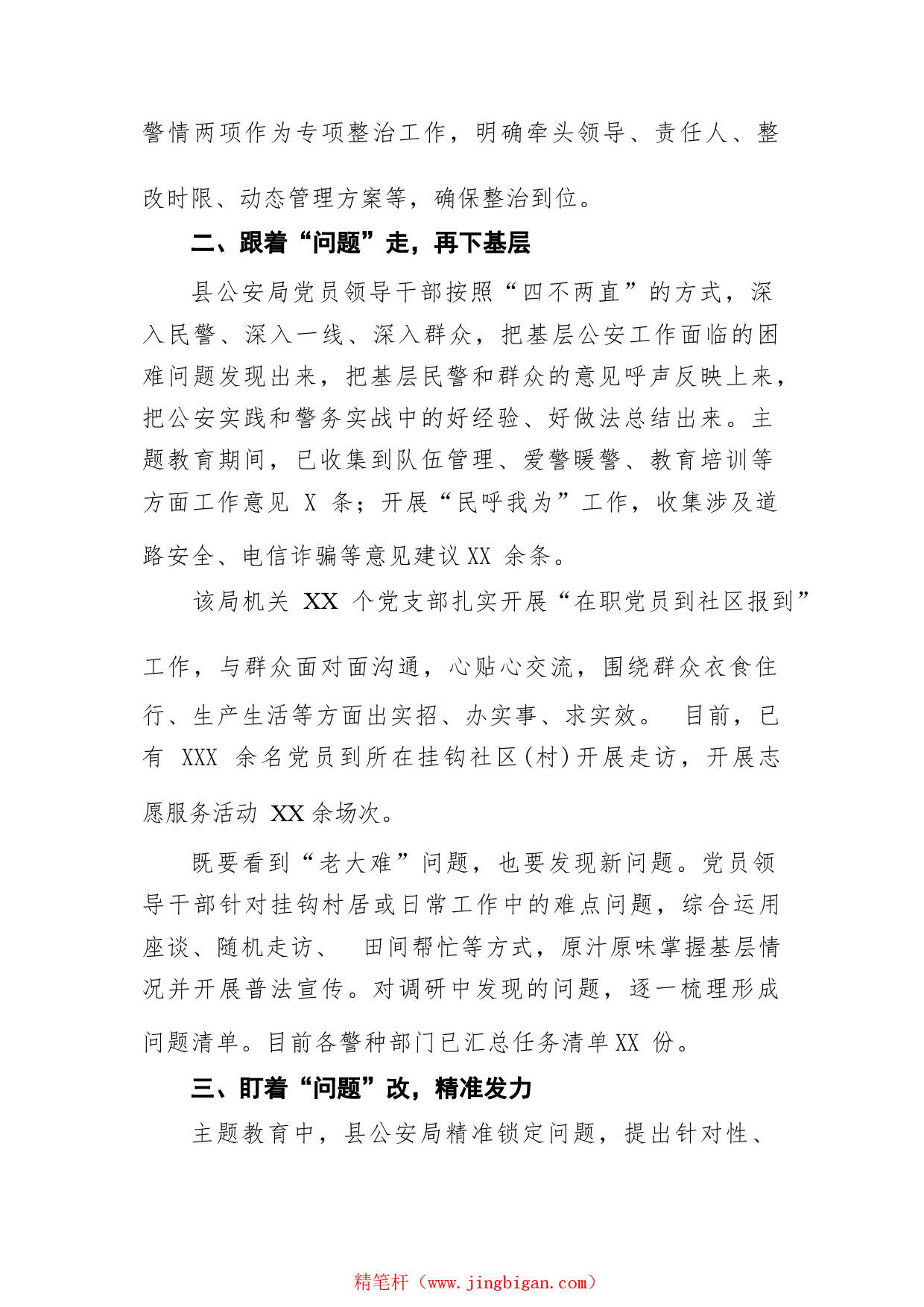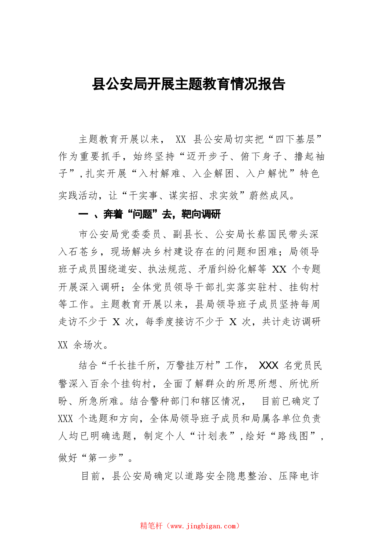 縣公安局開(kāi)展主題教育情況報(bào)告主題教育開(kāi)展以來(lái),XX縣公安局切實(shí)把“四下基層”作為重要抓手,始終堅(jiān)持“邁開(kāi)步子、俯下身子、擼起袖子”,扎實(shí)開(kāi)展“入村解難、入企解困、入戶解憂”特色實(shí)踐活動(dòng),讓“干實(shí)事、謀實(shí)招、求實(shí)效”蔚然成風(fēng)。一、奔著“問(wèn)題”去,靶向調(diào)研市公安局黨委委員、副縣長(zhǎng)、公安局長(zhǎng)蔡國(guó)民帶頭深入石蒼鄉(xiāng),現(xiàn)場(chǎng)解決鄉(xiāng)村建設(shè)存在的問(wèn)題和困難;局領(lǐng)導(dǎo)班子成員圍繞道安、執(zhí)法規(guī)范、矛盾糾紛化解等XX個(gè)專題開(kāi)展深入調(diào)研;全體黨員領(lǐng)導(dǎo)干部扎實(shí)落實(shí)駐村、掛鉤村等工作。主題教育開(kāi)展以來(lái),縣局領(lǐng)導(dǎo)班子成員堅(jiān)持每周走訪不少于X次,每季度接訪不少于X次...