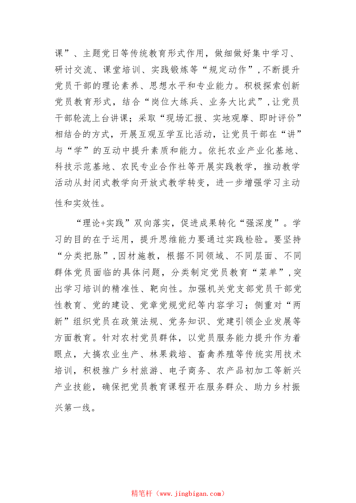 黨員教育培訓研討會上發(fā)言稿黨員教育是黨的建設的重要基礎工作和長期戰(zhàn)略任務,是每位黨員的必修課,是黨常抓不懈的政治任務,對于培養(yǎng)國家儲備人才、建設干部隊伍意義重大。新形勢下,各級黨組織要立足實際、精心謀劃,通過延伸陣地觸角、創(chuàng)新方式方法、注重學習實效,不斷推動黨員教育走深走實、見行見效,切實為基層黨員“充電蓄能”。“線上+線下”雙維發(fā)力,拓寬教育渠道“增廣度”。隨著信息技術高速發(fā)展、智能電子設備的不斷普及,學習渠道已延伸到網(wǎng)絡,黨員教育培訓也要創(chuàng)新方式,要堅持“線上+線下”同頻發(fā)力,線上通過“學習強國”“共產(chǎn)黨員網(wǎng)”“黨課開講啦...
