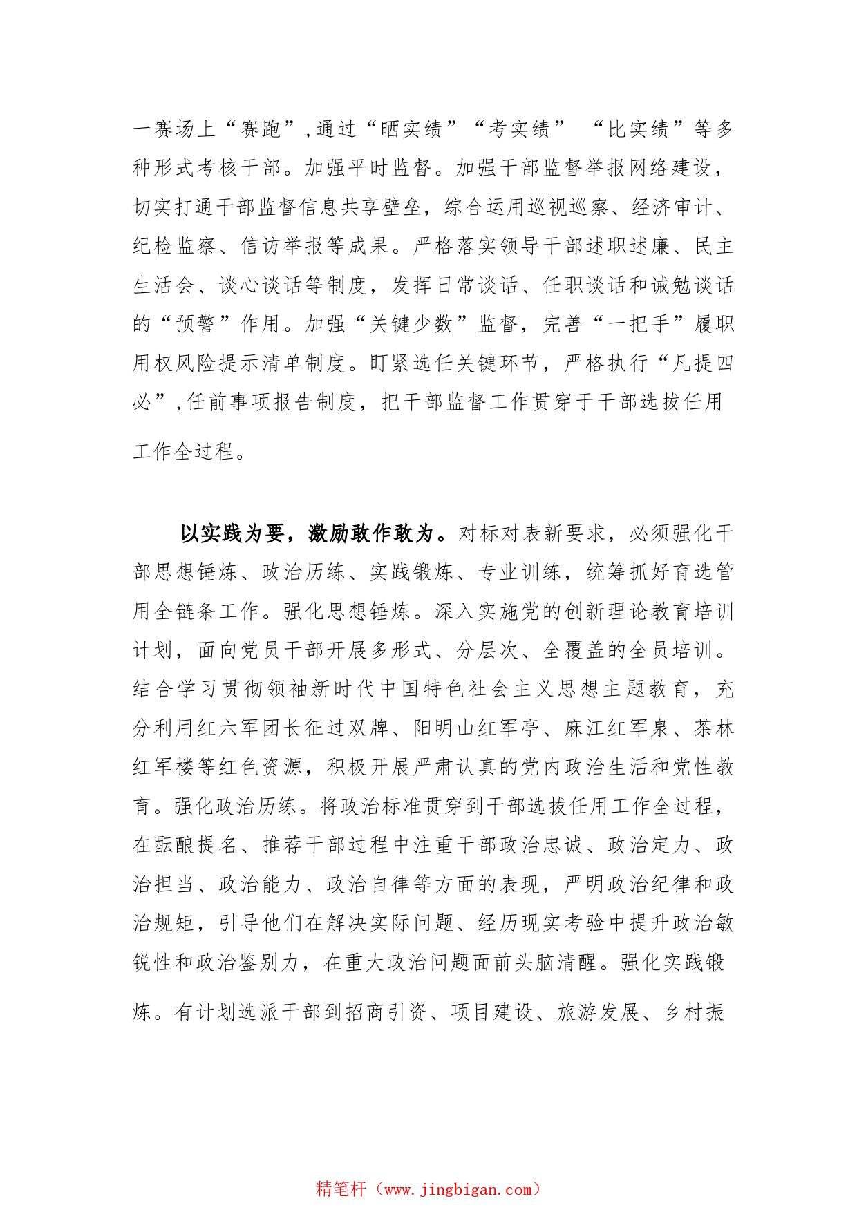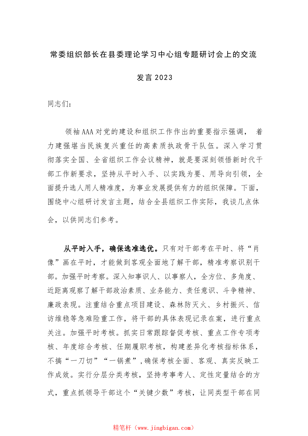 常委組織部長在縣委理論學習中心組專題研討會上的交流發(fā)言2023同志們:領(lǐng)袖AAA對黨的建設和組織工作作出的重要指示強調(diào),著力建強堪當民族復興重任的高素質(zhì)執(zhí)政骨干隊伍。深入學習貫徹落實全國、全省組織工作會議精神,就是要深刻領(lǐng)悟新時代干部工作新要求,堅持從平時入手、以實踐為要、用導向引領(lǐng),全面提升選人用人精準度,為事業(yè)發(fā)展提供有力的組織保障。下面,圍繞中心組研討發(fā)言主題,結(jié)合全縣組織工作實際,我談幾點體會,以供同志們參考。從平時入手,確保選準選優(yōu)。只有對干部考在平時、將“肖像”畫在平時,才能做到客觀全面地了解干部,精準考察識別干部。加...