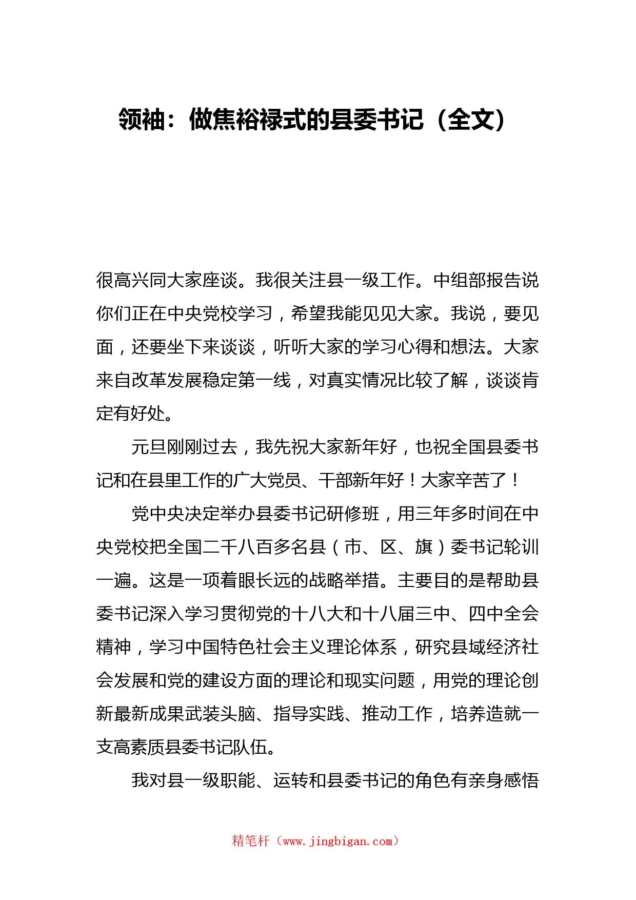 領(lǐng)袖:做焦裕祿式的縣委書記(全文)很高興同大家座談。我很關(guān)注縣一級工作。中組部報告說你們正在中央黨校學(xué)習(xí),希望我能見見大家。我說,要見面,還要坐下來談?wù)?,聽聽大家的學(xué)習(xí)心得和想法。大家來自改革發(fā)展穩(wěn)定第一線,對真實情況比較了解,談?wù)効隙ㄓ泻锰?。元旦剛剛過去,我先祝大家新年好,也祝全國縣委書記和在縣里工作的廣大黨員、干部新年好!大家辛苦了!黨中央決定舉辦縣委書記研修班,用三年多時間在中央黨校把全國二千八百多名縣(市、區(qū)、旗)委書記輪訓(xùn)一遍。這是一項著眼長遠的戰(zhàn)略舉措。主要目的是幫助縣委書記深入學(xué)習(xí)貫徹黨的十八大和十八屆三中、四...