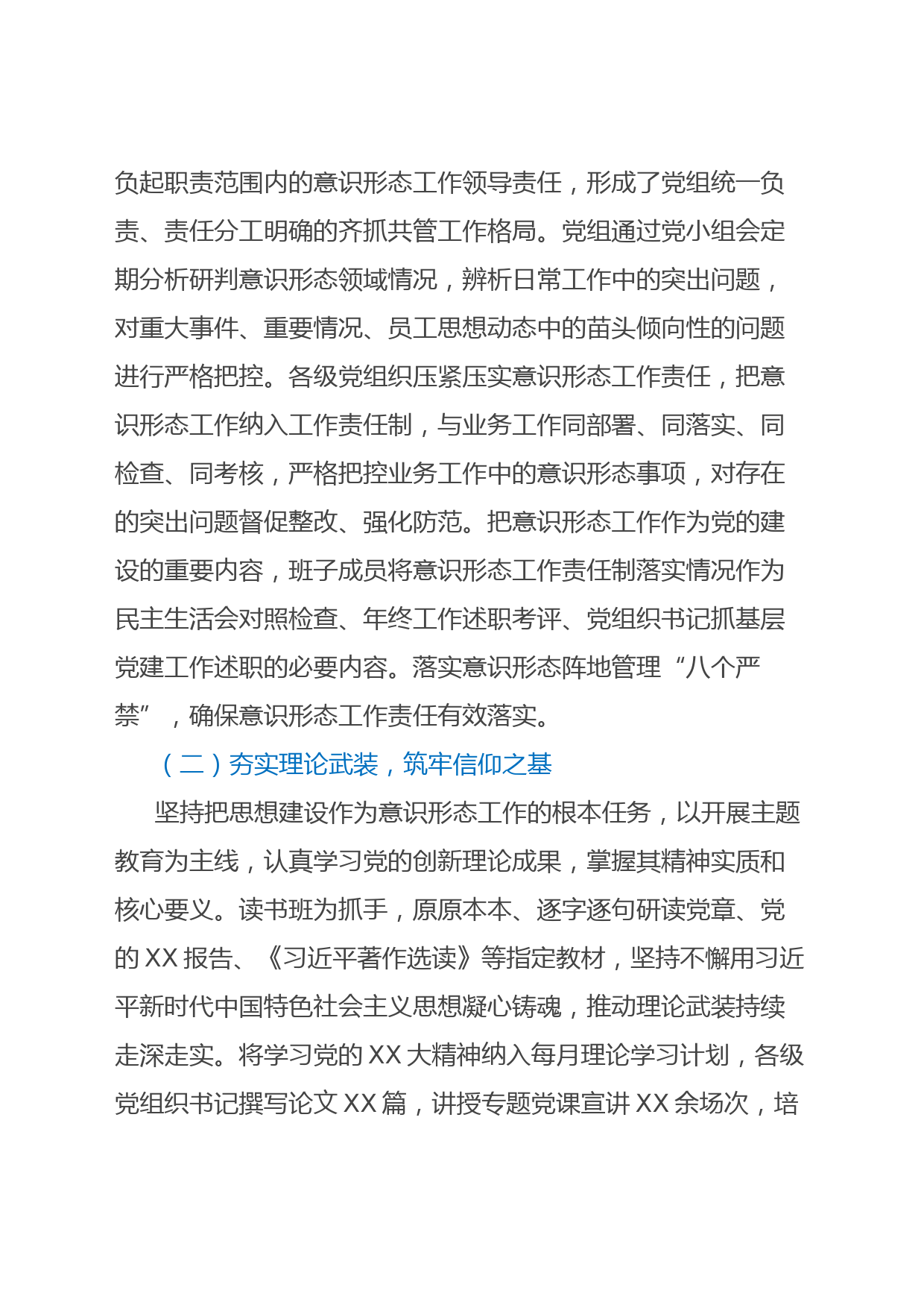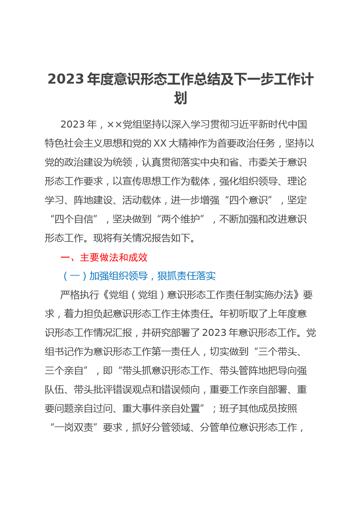2023年度意識形態(tài)工作總結及下一步工作計劃2023年,××黨組堅持以深入學習貫徹習近平新時代中國特色社會主義思想和黨的XX大精神作為首要政治任務,堅持以黨的政治建設為統(tǒng)領,認真貫徹落實中央和省、市委關于意識形態(tài)工作要求,以宣傳思想工作為載體,強化組織領導、理論學習、陣地建設、活動載體,進一步增強“四個意識”,堅定“四個自信”,堅決做到“兩個維護”,不斷加強和改進意識形態(tài)工作?,F(xiàn)將有關情況報告如下。一、主要做法和成效(一)加強組織領導,狠抓責任落實嚴格執(zhí)行《黨組(黨組)意識形態(tài)工作責任制實施辦法》要求,著力擔負起意識形態(tài)工作主體責任。...