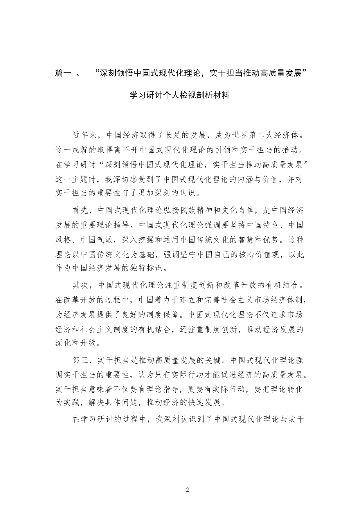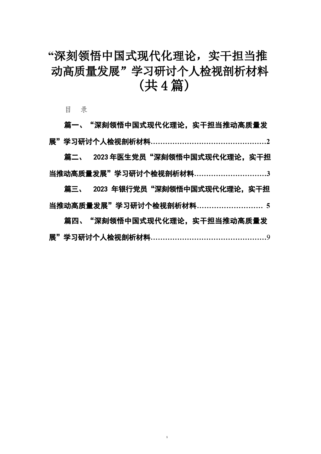 “深刻領(lǐng)悟中國式現(xiàn)代化理論,實干擔(dān)當(dāng)推動高質(zhì)量發(fā)展”學(xué)習(xí)研討個人檢視剖析材料(共4篇)目錄篇一、“深刻領(lǐng)悟中國式現(xiàn)代化理論,實干擔(dān)當(dāng)推動高質(zhì)量發(fā)展”學(xué)習(xí)研討個人檢視剖析材料…………………………………………2篇二、2023年醫(yī)生黨員“深刻領(lǐng)悟中國式現(xiàn)代化理論,實干擔(dān)當(dāng)推動高質(zhì)量發(fā)展”學(xué)習(xí)研討個檢視剖析材料…………………………3篇三、2023年銀行黨員“深刻領(lǐng)悟中國式現(xiàn)代化理論,實干擔(dān)當(dāng)推動高質(zhì)量發(fā)展”學(xué)習(xí)研討個檢視剖析材料………………………5篇四、“深刻領(lǐng)悟中國式現(xiàn)代化理論,實干擔(dān)當(dāng)推動高質(zhì)量發(fā)展”學(xué)習(xí)研討個人檢視剖析材料………………………...