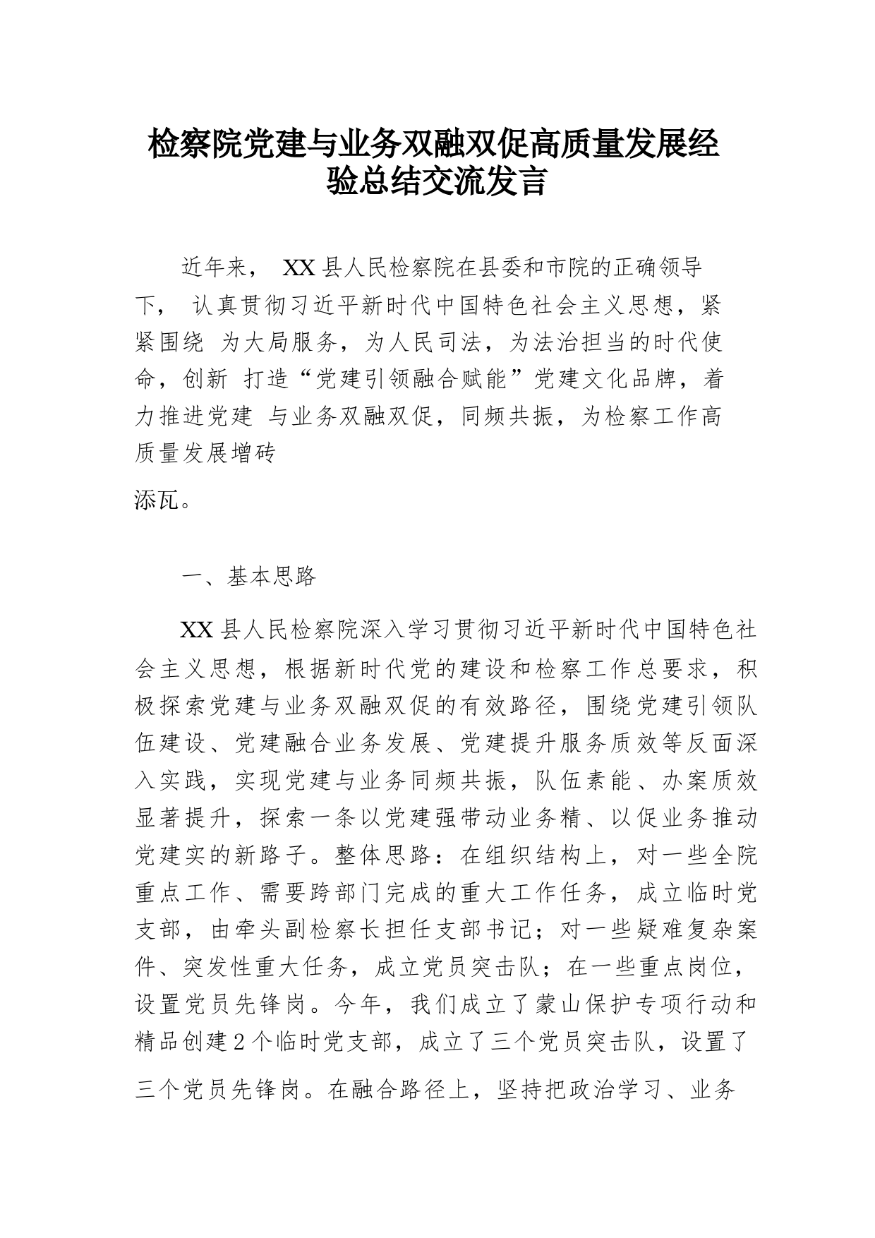 檢察院黨建與業(yè)務(wù)雙融雙促高質(zhì)量發(fā)展經(jīng)驗總結(jié)交流發(fā)言近年來,XX縣人民檢察院在縣委和市院的正確領(lǐng)導下,認真貫徹習近平新時代中國特色社會主義思想,緊緊圍繞為大局服務(wù),為人民司法,為法治擔當?shù)臅r代使命,創(chuàng)新打造“黨建引領(lǐng)融合賦能”黨建文化品牌,著力推進黨建與業(yè)務(wù)雙融雙促,同頻共振,為檢察工作高質(zhì)量發(fā)展增磚添瓦。一、基本思路XX縣人民檢察院深入學習貫徹習近平新時代中國特色社會主義思想,根據(jù)新時代黨的建設(shè)和檢察工作總要求,積極探索黨建與業(yè)務(wù)雙融雙促的有效路徑,圍繞黨建引領(lǐng)隊伍建設(shè)、黨建融合業(yè)務(wù)發(fā)展、黨建提升服務(wù)質(zhì)效等反面深入實踐,實現(xiàn)黨建...