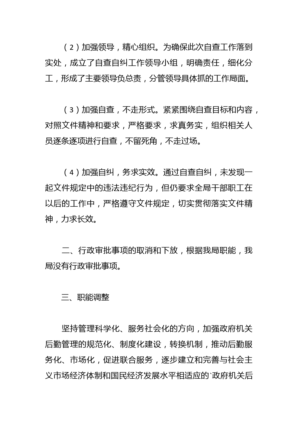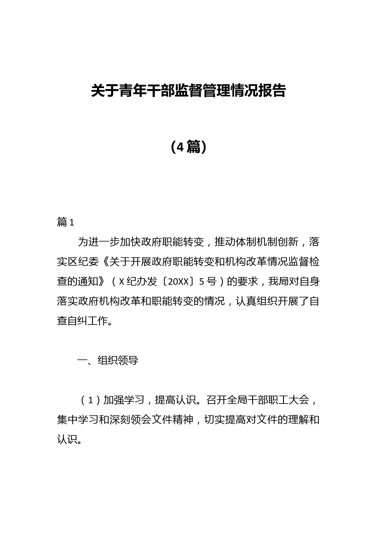 關(guān)于青年干部監(jiān)督管理情況報(bào)告(4篇)篇1為進(jìn)一步加快政府職能轉(zhuǎn)變,推動(dòng)體制機(jī)制創(chuàng)新,落實(shí)區(qū)紀(jì)委《關(guān)于開展政府職能轉(zhuǎn)變和機(jī)構(gòu)改革情況監(jiān)督檢查的通知》(X紀(jì)辦發(fā)〔20XX〕5號(hào))的要求,我局對(duì)自身落實(shí)政府機(jī)構(gòu)改革和職能轉(zhuǎn)變的情況,認(rèn)真組織開展了自查自糾工作。一、組織領(lǐng)導(dǎo)(1)加強(qiáng)學(xué)習(xí),提高認(rèn)識(shí)。召開全局干部職工大會(huì),集中學(xué)習(xí)和深刻領(lǐng)會(huì)文件精神,切實(shí)提高對(duì)文件的理解和認(rèn)識(shí)。(2)加強(qiáng)領(lǐng)導(dǎo),精心組織。為確保此次自查工作落到實(shí)處,成立了自查自糾工作領(lǐng)導(dǎo)小組,明確責(zé)任,細(xì)化分工,形成了主要領(lǐng)導(dǎo)負(fù)總責(zé),分管領(lǐng)導(dǎo)具體抓的工作局面。(3)加強(qiáng)自查,不走...