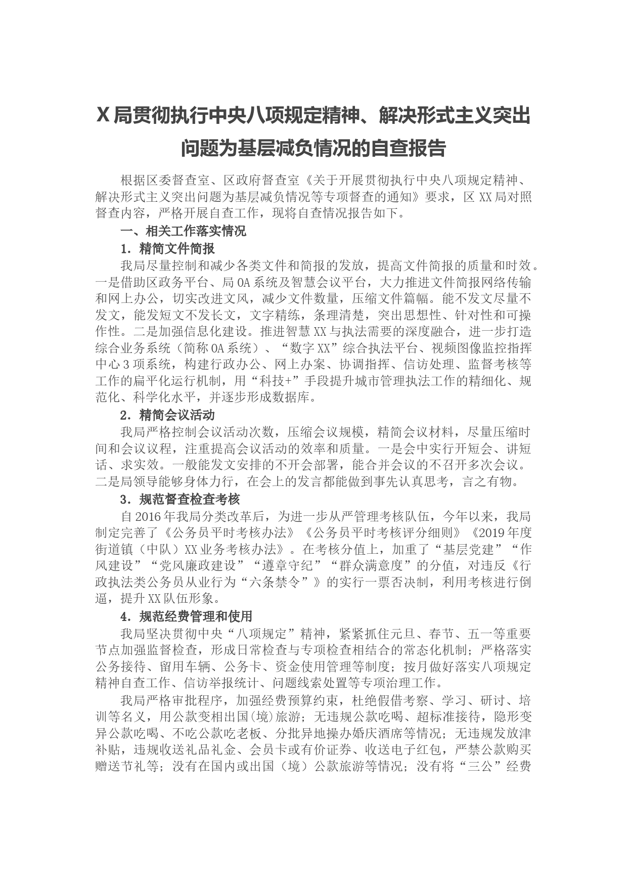 X局貫徹執(zhí)行中央八項規(guī)定精神、解決形式主義突出問題為基層減負(fù)情況的自查報告根據(jù)區(qū)委督查室、區(qū)政府督查室《關(guān)于開展貫徹執(zhí)行中央八項規(guī)定精神、解決形式主義突出問題為基層減負(fù)情況等專項督查的通知》要求,區(qū)XX局對照督查內(nèi)容,嚴(yán)格開展自查工作,現(xiàn)將自查情況報告如下。一、相關(guān)工作落實情況1.精簡文件簡報我局盡量控制和減少各類文件和簡報的發(fā)放,提高文件簡報的質(zhì)量和時效。一是借助區(qū)政務(wù)平臺、局OA系統(tǒng)及智慧會議平臺,大力推進文件簡報網(wǎng)絡(luò)傳輸和網(wǎng)上辦公,切實改進文風(fēng),減少文件數(shù)量,壓縮文件篇幅。能不發(fā)文盡量不發(fā)文,能發(fā)短文不發(fā)長文,文字精練,條理...