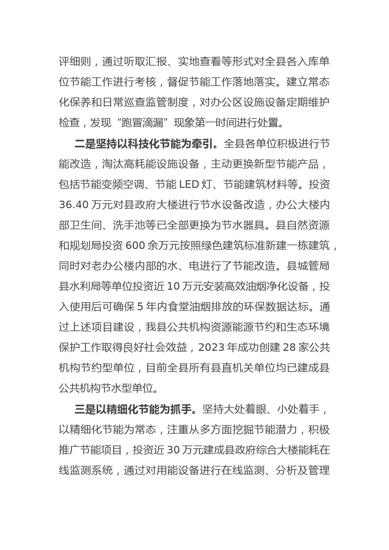 全市節(jié)能工作交流部署會(huì)發(fā)言材料2023年以來(lái),縣大力開(kāi)展公共機(jī)構(gòu)節(jié)能工作,采取以標(biāo)準(zhǔn)化節(jié)能為重點(diǎn)、以科技化節(jié)能為牽引、以精細(xì)化節(jié)能為抓手、以立體化宣傳為載體,推動(dòng)公共機(jī)構(gòu)節(jié)能工作由一般化管理向標(biāo)準(zhǔn)化、精細(xì)化管理轉(zhuǎn)變,由定性化管理向定量化、數(shù)字化管理轉(zhuǎn)變,由傳統(tǒng)型公共機(jī)構(gòu)向綠色、智慧型公共機(jī)構(gòu)轉(zhuǎn)變,各項(xiàng)能耗指標(biāo)明顯下降,充分發(fā)揮了公共機(jī)構(gòu)的示范引領(lǐng)作用。一、本地區(qū)節(jié)能亮點(diǎn)工作一是堅(jiān)持以標(biāo)準(zhǔn)化節(jié)能為重點(diǎn)??h委、縣政府高度重視公共機(jī)構(gòu)節(jié)能工作,研究制定《2023年公共機(jī)構(gòu)能源資源節(jié)約和生態(tài)環(huán)境保護(hù)工作安排》,將公共機(jī)構(gòu)節(jié)能納入全縣經(jīng)濟(jì)社會(huì)...