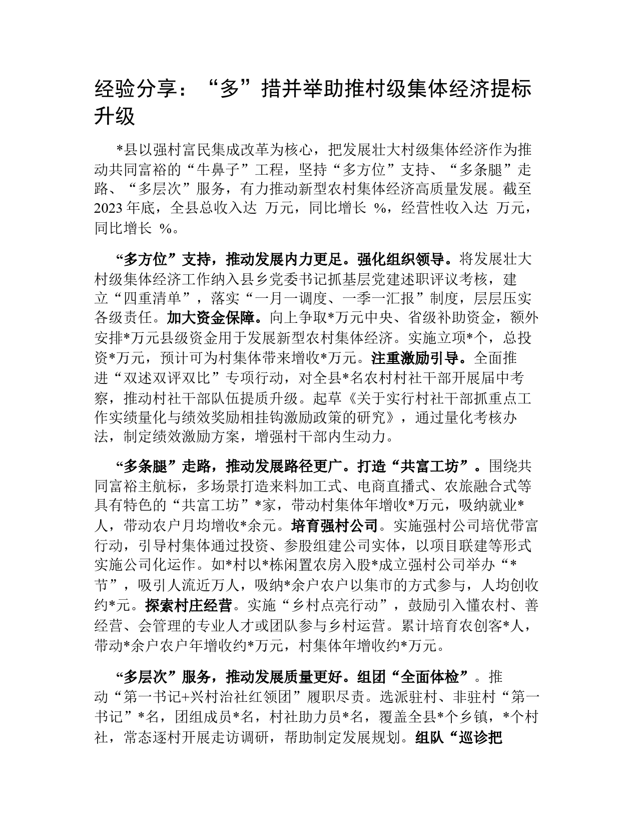 經(jīng)驗(yàn)分享:“多”措并舉助推村級(jí)集體經(jīng)濟(jì)提標(biāo)升級(jí)縣以強(qiáng)村富民集成改革為核心,把發(fā)展壯大村級(jí)集體經(jīng)濟(jì)作為推動(dòng)共同富裕的“牛鼻子”工程,堅(jiān)持“多方位”支持、“多條腿”走路、“多層次”服務(wù),有力推動(dòng)新型農(nóng)村集體經(jīng)濟(jì)高質(zhì)量發(fā)展。截至2023年底,全縣總收入達(dá)萬元,同比增長(zhǎng)%,經(jīng)營(yíng)性收入達(dá)萬元,同比增長(zhǎng)%。“多方位”支持,推動(dòng)發(fā)展內(nèi)力更足。強(qiáng)化組織領(lǐng)導(dǎo)。將發(fā)展壯大村級(jí)集體經(jīng)濟(jì)工作納入縣鄉(xiāng)黨委書記抓基層黨建述職評(píng)議考核,建立“四重清單”,落實(shí)“一月一調(diào)度、一季一匯報(bào)”制度,層層壓實(shí)各級(jí)責(zé)任。加大資金保障。向上爭(zhēng)取萬元中央、省級(jí)補(bǔ)助資金,額外安排...