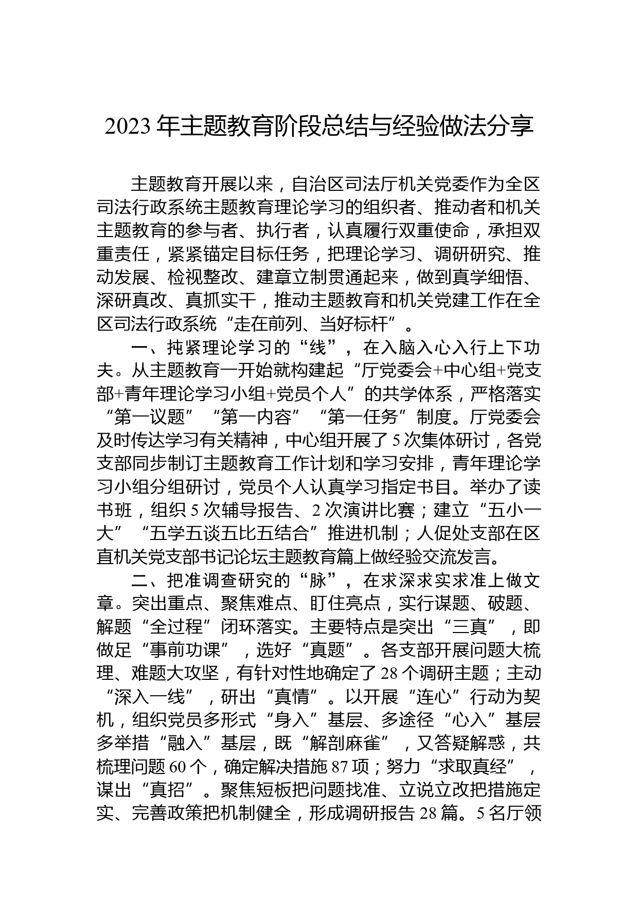 2023年主題教育階段總結與經驗做法分享主題教育開展以來,自治區(qū)司法廳機關黨委作為全區(qū)司法行政系統(tǒng)主題教育理論學習的組織者、推動者和機關主題教育的參與者、執(zhí)行者,認真履行雙重使命,承擔雙重責任,緊緊錨定目標任務,把理論學習、調研研究、推動發(fā)展、檢視整改、建章立制貫通起來,做到真學細悟、深研真改、真抓實干,推動主題教育和機關黨建工作在全區(qū)司法行政系統(tǒng)“走在前列、當好標桿”。一、扽緊理論學習的“線”,在入腦入心入行上下功夫。從主題教育一開始就構建起“廳黨委會+中心組+黨支部+青年理論學習小組+黨員個人”的共學體系,嚴格落實“第一議題”“...