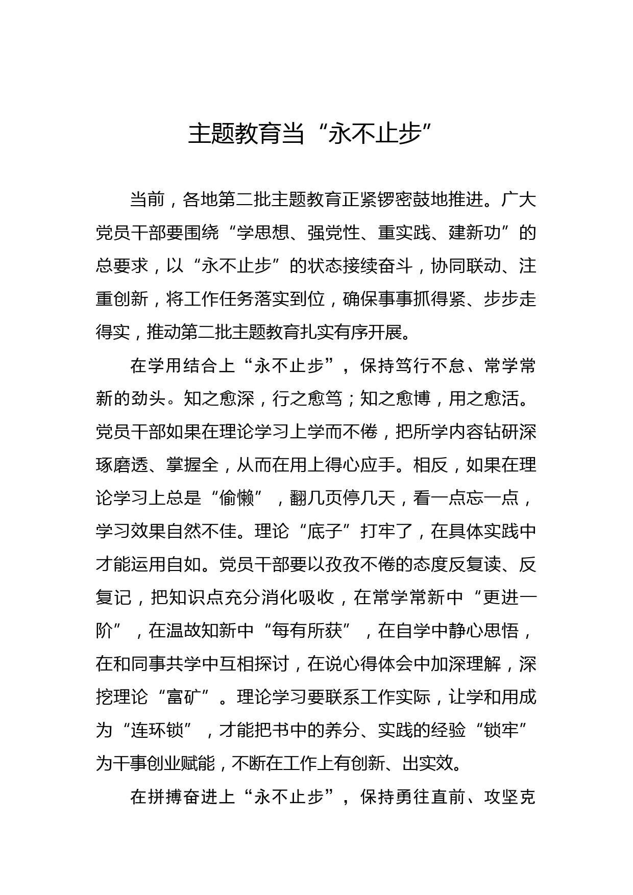 主題教育當(dāng)“永不止步”當(dāng)前,各地第二批主題教育正緊鑼密鼓地推進(jìn)。廣大黨員干部要圍繞“學(xué)思想、強(qiáng)黨性、重實(shí)踐、建新功”的總要求,以“永不止步”的狀態(tài)接續(xù)奮斗,協(xié)同聯(lián)動(dòng)、注重創(chuàng)新,將工作任務(wù)落實(shí)到位,確保事事抓得緊、步步走得實(shí),推動(dòng)第二批主題教育扎實(shí)有序開(kāi)展。在學(xué)用結(jié)合上“永不止步”,保持篤行不怠、常學(xué)常新的勁頭。知之愈深,行之愈篤;知之愈博,用之愈活。黨員干部如果在理論學(xué)習(xí)上學(xué)而不倦,把所學(xué)內(nèi)容鉆研深琢磨透、掌握全,從而在用上得心應(yīng)手。相反,如果在理論學(xué)習(xí)上總是“偷懶”,翻幾頁(yè)停幾天,看一點(diǎn)忘一點(diǎn),學(xué)習(xí)效果自然不佳。理論“底子...