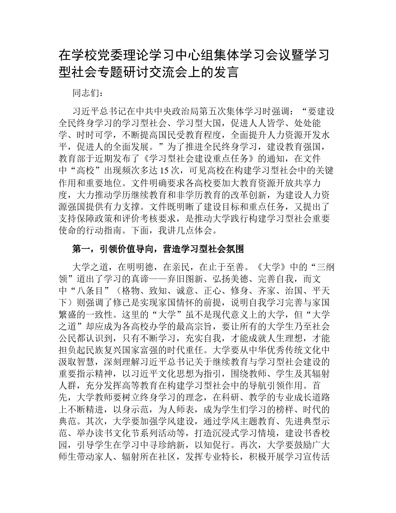 在學(xué)校黨委理論學(xué)習(xí)中心組集體學(xué)習(xí)會議暨學(xué)習(xí)型社會專題研討交流會上的發(fā)言VIP免費