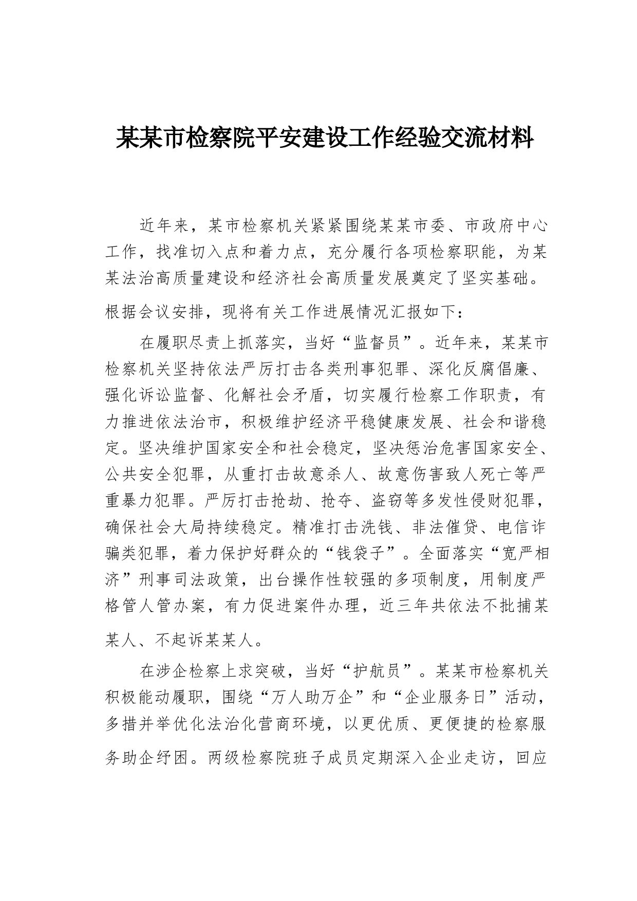 某某市檢察院平安建設(shè)工作經(jīng)驗(yàn)交流材料近年來(lái),某市檢察機(jī)關(guān)緊緊圍繞某某市委、市政府中心工作,找準(zhǔn)切入點(diǎn)和著力點(diǎn),充分履行各項(xiàng)檢察職能,為某某法治高質(zhì)量建設(shè)和經(jīng)濟(jì)社會(huì)高質(zhì)量發(fā)展奠定了堅(jiān)實(shí)基礎(chǔ)。根據(jù)會(huì)議安排,現(xiàn)將有關(guān)工作進(jìn)展情況匯報(bào)如下:在履職盡責(zé)上抓落實(shí),當(dāng)好“監(jiān)督員”。近年來(lái),某某市檢察機(jī)關(guān)堅(jiān)持依法嚴(yán)厲打擊各類刑事犯罪、深化反腐倡廉、強(qiáng)化訴訟監(jiān)督、化解社會(huì)矛盾,切實(shí)履行檢察工作職責(zé),有力推進(jìn)依法治市,積極維護(hù)經(jīng)濟(jì)平穩(wěn)健康發(fā)展、社會(huì)和諧穩(wěn)定。堅(jiān)決維護(hù)國(guó)家安全和社會(huì)穩(wěn)定,堅(jiān)決懲治危害國(guó)家安全、公共安全犯罪,從重打擊故意殺人、故意傷...