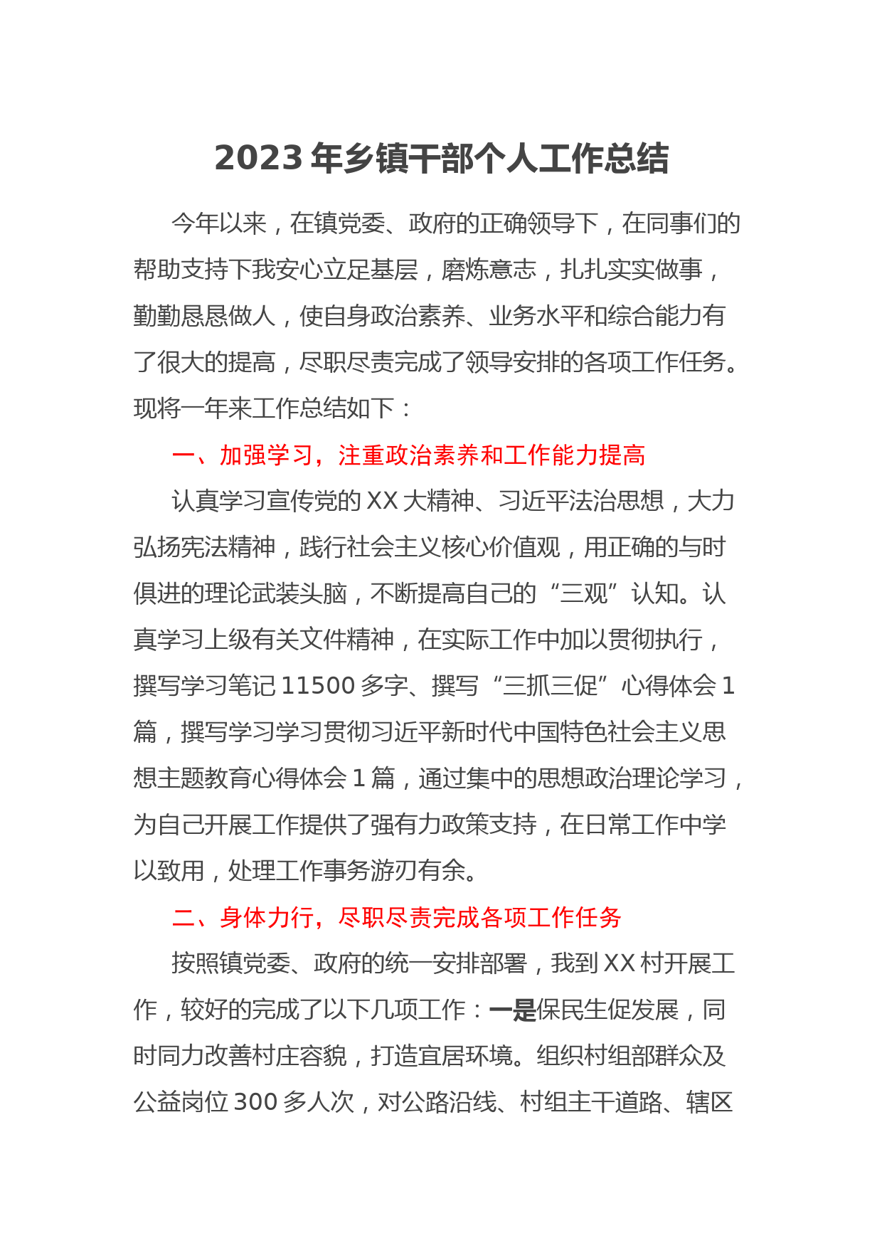 2023年鄉(xiāng)鎮(zhèn)干部個人工作總結VIP免費