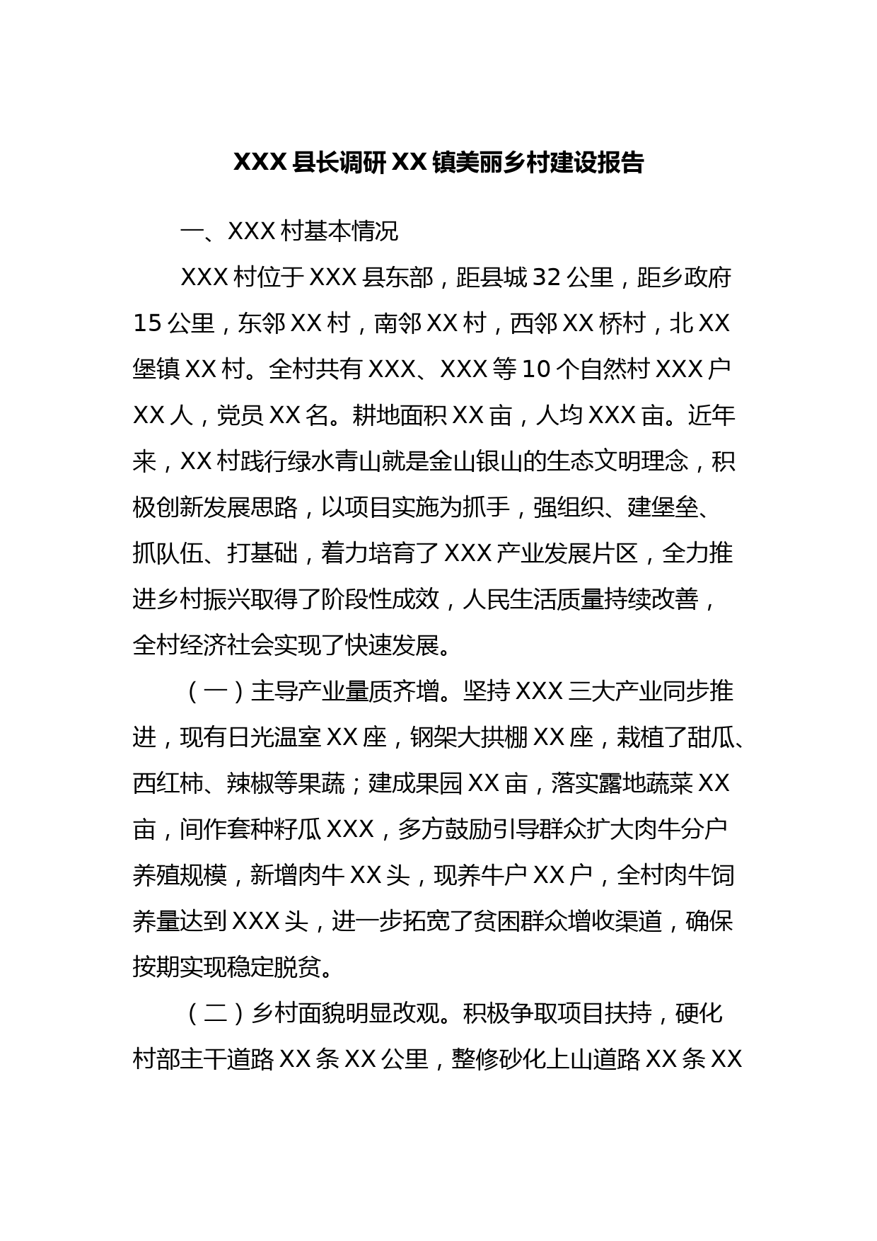 XXX縣長調(diào)研XX鎮(zhèn)美麗鄉(xiāng)村建設(shè)報告一、XXX村基本情況XXX村位于XXX縣東部,距縣城32公里,距鄉(xiāng)政府15公里,東鄰XX村,南鄰XX村,西鄰XX橋村,北XX堡鎮(zhèn)XX村。全村共有XXX、XXX等10個自然村XXX戶XX人,黨員XX名。耕地面積XX畝,人均XXX畝。近年來,XX村踐行綠水青山就是金山銀山的生態(tài)文明理念,積極創(chuàng)新發(fā)展思路,以項目實施為抓手,強組織、建堡壘、抓隊伍、打基礎(chǔ),著力培育了XXX產(chǎn)業(yè)發(fā)展片區(qū),全力推進鄉(xiāng)村振興取得了階段性成效,人民生活質(zhì)量持續(xù)改善,全村經(jīng)濟社會實現(xiàn)了快速發(fā)展。(一)主導(dǎo)產(chǎn)業(yè)量質(zhì)齊增。堅持XXX三大產(chǎn)業(yè)同步推進,現(xiàn)有日光溫室XX座,鋼架大拱棚XX座...