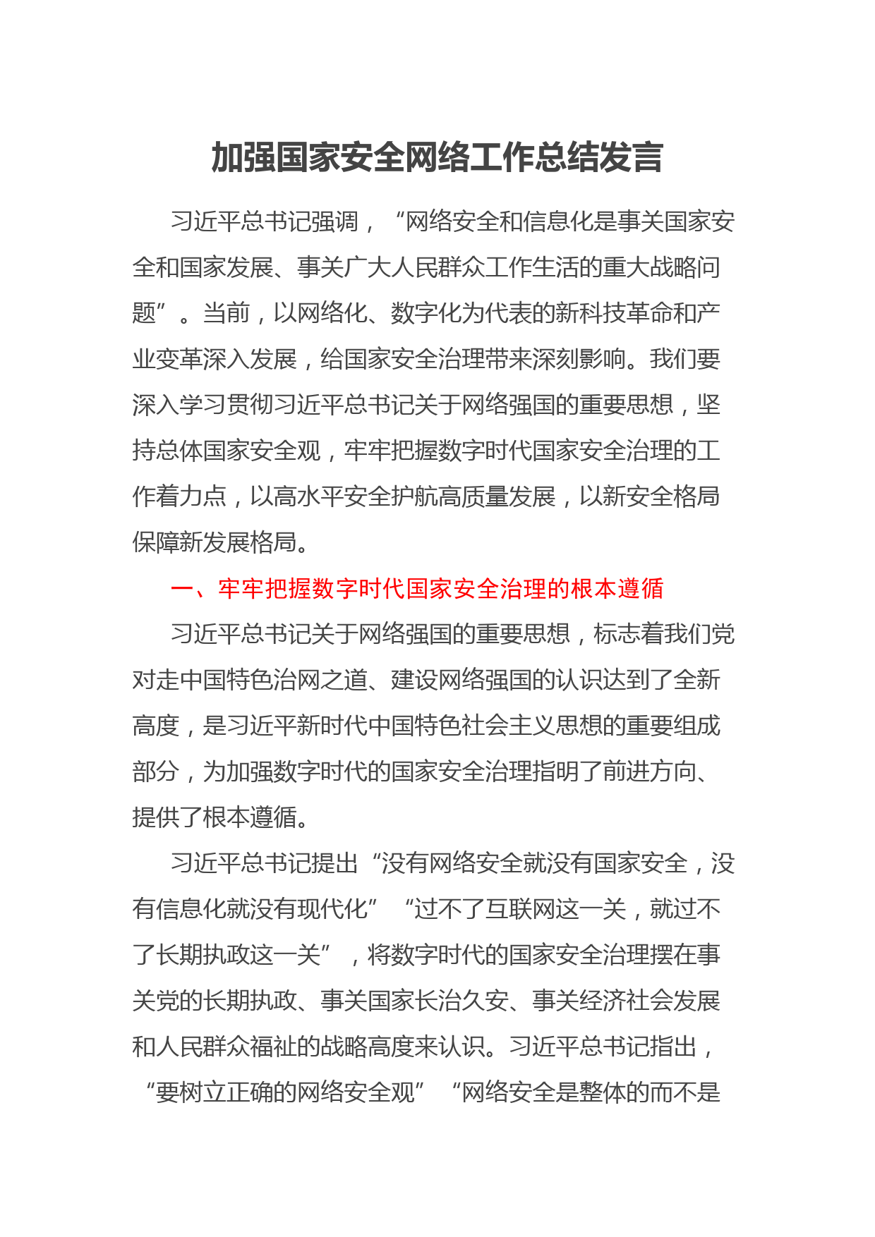 加強(qiáng)國(guó)家安全網(wǎng)絡(luò)工作總結(jié)發(fā)言VIP免費(fèi)