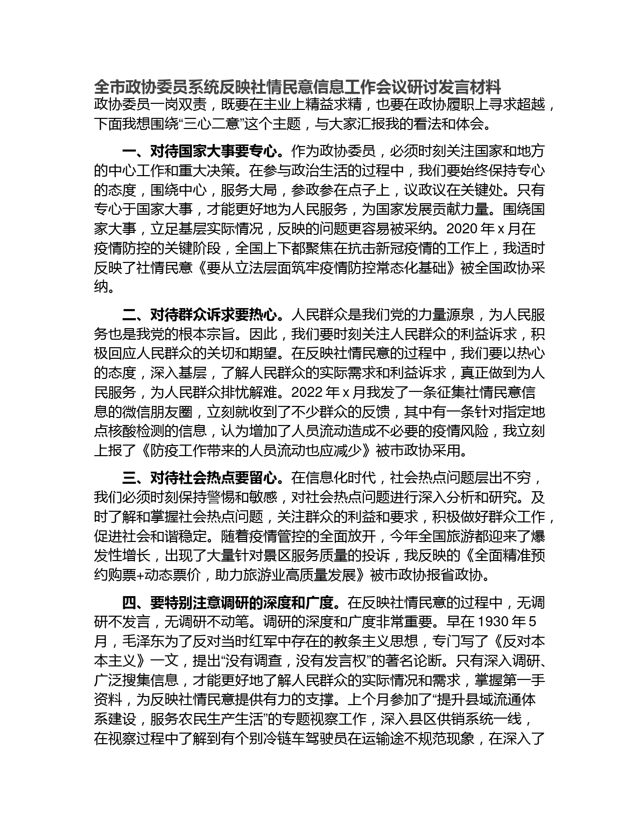 全市政協(xié)委員系統(tǒng)反映社情民意信息工作會(huì)議研討發(fā)言材料政協(xié)委員一崗雙責(zé),既要在主業(yè)上精益求精,也要在政協(xié)履職上尋求超越,下面我想圍繞“三心二意”這個(gè)主題,與大家匯報(bào)我的看法和體會(huì)。一、對(duì)待國(guó)家大事要專(zhuān)心。作為政協(xié)委員,必須時(shí)刻關(guān)注國(guó)家和地方的中心工作和重大決策。在參與政治生活的過(guò)程中,我們要始終保持專(zhuān)心的態(tài)度,圍繞中心,服務(wù)大局,參政參在點(diǎn)子上,議政議在關(guān)鍵處。只有專(zhuān)心于國(guó)家大事,才能更好地為人民服務(wù),為國(guó)家發(fā)展貢獻(xiàn)力量。圍繞國(guó)家大事,立足基層實(shí)際情況,反映的問(wèn)題更容易被采納。2020年x月在疫情防控的關(guān)鍵階段,全國(guó)上下都聚焦在抗...