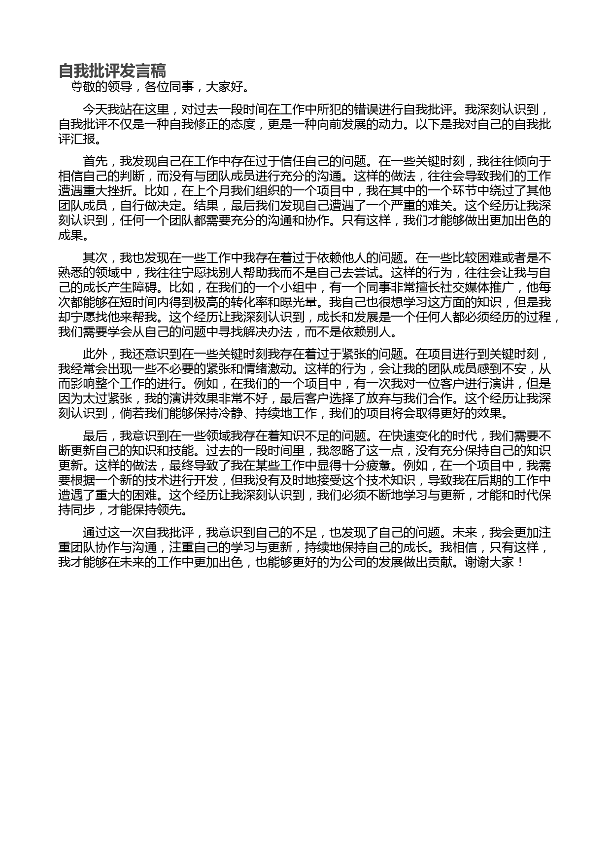 自我批評發(fā)言稿尊敬的領(lǐng)導(dǎo),各位同事,大家好。今天我站在這里,對過去一段時間在工作中所犯的錯誤進(jìn)行自我批評。我深刻認(rèn)識到,自我批評不僅是一種自我修正的態(tài)度,更是一種向前發(fā)展的動力。以下是我對自己的自我批評匯報。首先,我發(fā)現(xiàn)自己在工作中存在過于信任自己的問題。在一些關(guān)鍵時刻,我往往傾向于相信自己的判斷,而沒有與團(tuán)隊成員進(jìn)行充分的溝通。這樣的做法,往往會導(dǎo)致我們的工作遭遇重大挫折。比如,在上個月我們組織的一個項目中,我在其中的一個環(huán)節(jié)中繞過了其他團(tuán)隊成員,自行做決定。結(jié)果,最后我們發(fā)現(xiàn)自己遭遇了一個嚴(yán)重的難關(guān)。這個經(jīng)歷讓我深刻認(rèn)識...