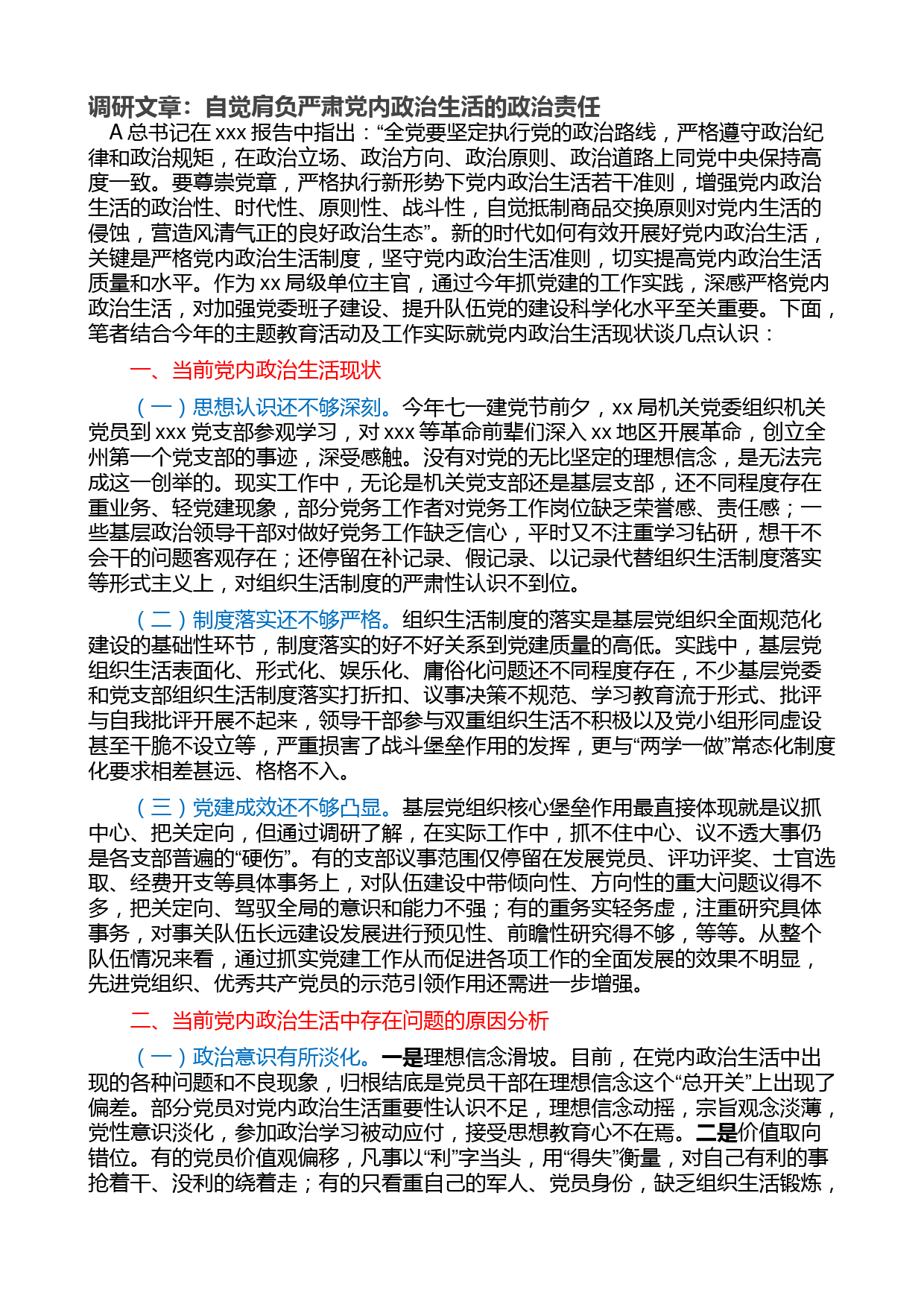 調(diào)研文章:自覺肩負嚴肅黨內(nèi)政治生活的政治責任A總書記在xxx報告中指出:“全黨要堅定執(zhí)行黨的政治路線,嚴格遵守政治紀律和政治規(guī)矩,在政治立場、政治方向、政治原則、政治道路上同黨中央保持高度一致。要尊崇黨章,嚴格執(zhí)行新形勢下黨內(nèi)政治生活若干準則,增強黨內(nèi)政治生活的政治性、時代性、原則性、戰(zhàn)斗性,自覺抵制商品交換原則對黨內(nèi)生活的侵蝕,營造風清氣正的良好政治生態(tài)”。新的時代如何有效開展好黨內(nèi)政治生活,關(guān)鍵是嚴格黨內(nèi)政治生活制度,堅守黨內(nèi)政治生活準則,切實提高黨內(nèi)政治生活質(zhì)量和水平。作為xx局級單位主官,通過今年抓黨建的工作實踐,深感嚴格...