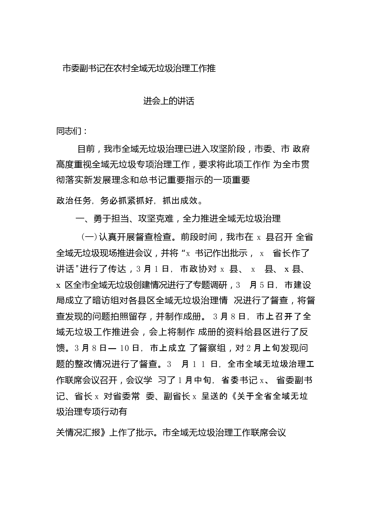 市委副書記在農(nóng)村全域無垃圾治理工作推進(jìn)會上的講話同志們:目前,我市全域無垃圾治理已進(jìn)入攻堅階段,市委、市政府高度重視全域無垃圾專項治理工作,要求將此項工作作為全市貫徹落實新發(fā)展理念和總書記重要指示的一項重要政治任務(wù),務(wù)必抓緊抓好,抓出成效。一、勇于擔(dān)當(dāng)、攻堅克難,全力推進(jìn)全域無垃圾治理(一)認(rèn)真開展督查檢查。前段時間,我市在x縣召開全省全域無垃圾現(xiàn)場推進(jìn)會議,并將“x書記作出批示,x省長作了講話"進(jìn)行了傳達(dá),3月1日,市政協(xié)對x縣、x縣、x縣、x區(qū)全市全域無垃圾創(chuàng)建情況進(jìn)行了專題調(diào)研,3月5日,市建設(shè)局成立了暗訪組對各縣區(qū)全域無垃圾治理情...