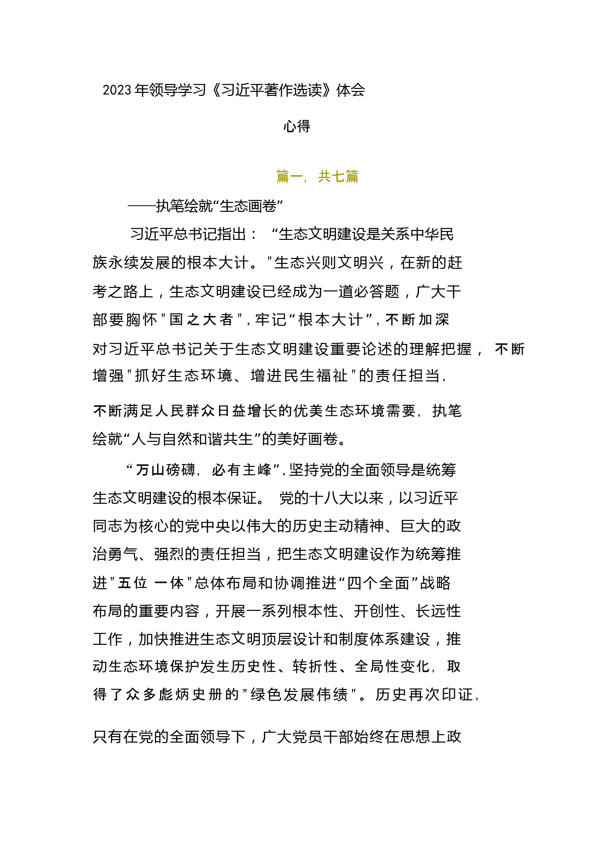 2023年領導學習《習近平著作選讀》體會心得篇一,共七篇——執(zhí)筆繪就“生態(tài)畫卷”習近平總書記指出:“生態(tài)文明建設是關系中華民族永續(xù)發(fā)展的根本大計。"生態(tài)興則文明興,在新的趕考之路上,生態(tài)文明建設已經(jīng)成為一道必答題,廣大干部要胸懷"國之大者",牢記“根本大計”,不斷加深對習近平總書記關于生態(tài)文明建設重要論述的理解把握,不斷增強"抓好生態(tài)環(huán)境、增進民生福祉"的責任擔當,不斷滿足人民群眾日益增長的優(yōu)美生態(tài)環(huán)境需要,執(zhí)筆繪就“人與自然和諧共生”的美好畫卷?!叭f山磅礴,必有主峰”,堅持黨的全面領導是統(tǒng)籌生態(tài)文明建設的根本保證。黨的十八大以來,以習...