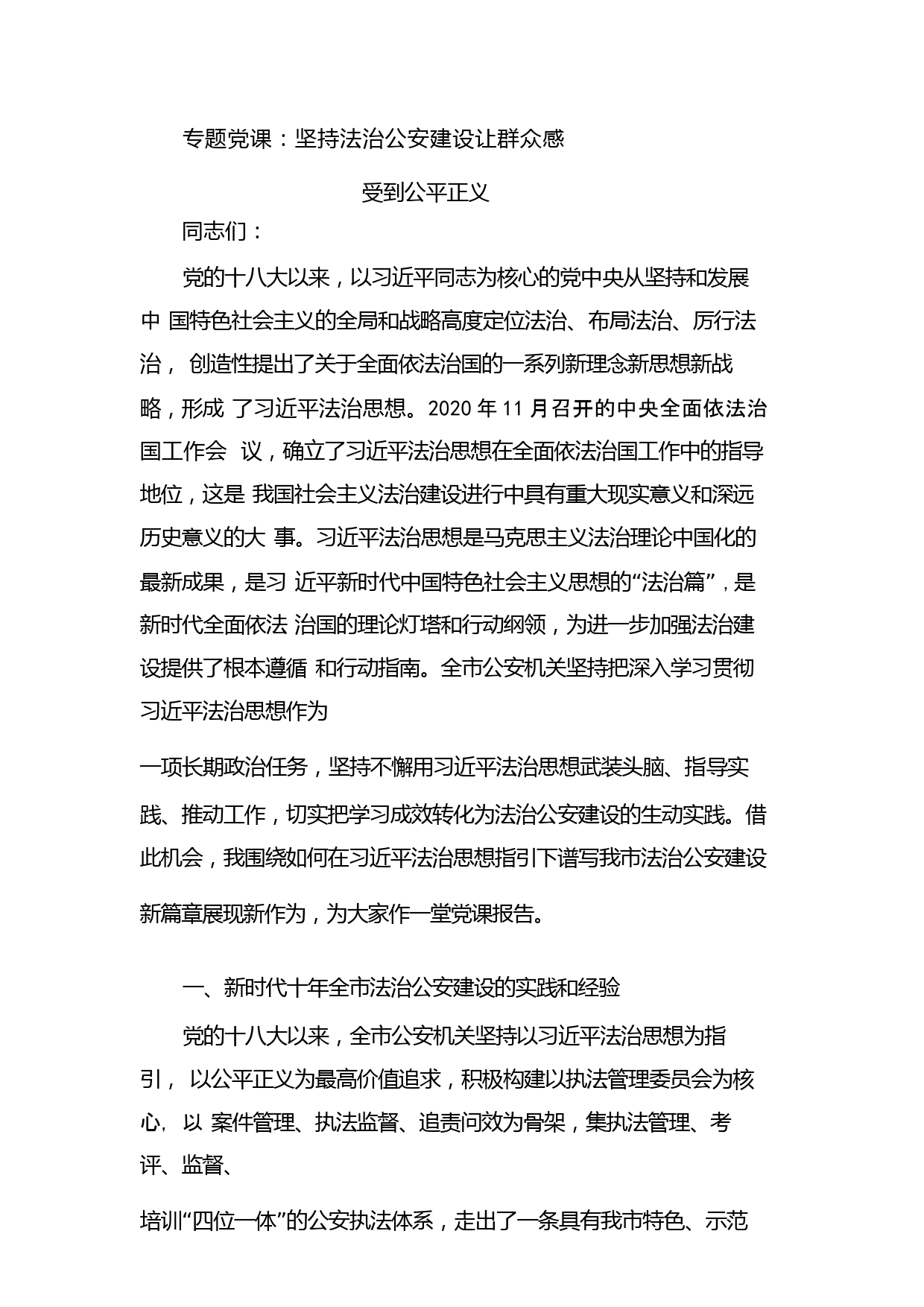 專題黨課:堅(jiān)持法治公安建設(shè)讓群眾感受到公平正義同志們:黨的十八大以來,以習(xí)近平同志為核心的黨中央從堅(jiān)持和發(fā)展中國特色社會(huì)主義的全局和戰(zhàn)略高度定位法治、布局法治、厲行法治,創(chuàng)造性提出了關(guān)于全面依法治國的一系列新理念新思想新戰(zhàn)略,形成了習(xí)近平法治思想。2020年11月召開的中央全面依法治國工作會(huì)議,確立了習(xí)近平法治思想在全面依法治國工作中的指導(dǎo)地位,這是我國社會(huì)主義法治建設(shè)進(jìn)行中具有重大現(xiàn)實(shí)意義和深遠(yuǎn)歷史意義的大事。習(xí)近平法治思想是馬克思主義法治理論中國化的最新成果,是習(xí)近平新時(shí)代中國特色社會(huì)主義思想的“法治篇”,是新時(shí)代全面依法治國...